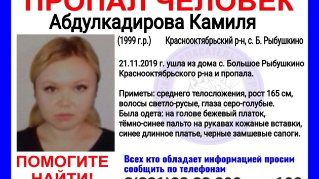 20-летняя девушка пропала в Краснооктябрьском районеВ Краснооктябрьском районе ищут 20-летнюю Камилю Абдулкадирову. Девушка ушла из дома в селе Большое Рыбушкино 21 ноября, и больше ее не видели. Поисково-спасательная группа «Рысь» просит помощи в поиске Камили. Также сообщается, что девушка может находиться в Нижнем Новгороде. Приметы: среднее телосложение, рост 165, светло-русые волосы, серо-голубые глаза. Была одета: на голове бежевый платок, темно-синее пальто с кожаными вставками на рукавах, длинное синее платье, черные замшевые сапоги. Всю информацию о пропавшей просят сообщать по телефону: 8 (831) 28 38 200 или по каналу «102» Ранее «Нижегородская правда» сообщала, что в Дзержинске нашли 40-летнего мужчину, пропавшего 5 дней назад.