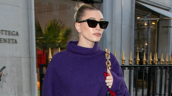 Хейли Бибер знает, что с такой фигурой может позволить себе самые смелые выходы. Но на этот раз даже она превзошла саму себя. Супруга Джастина Бибера составила яркий образ, с которым у нее не было ни одного шанса остаться незамеченной папарацци. Хейли сделала ставку на цвет: насыщенный фиолетовый оттенок идеально дополнил ее белые локоны. Модель надела свободный свитер с круглым горлом и макси-юбку под кожу с головокружительным разрезом до самого бедра. По замыслу звезды, юбка шла в дуэте с чулками в тон, похожими на легинсы. Завершающей деталью стали атласные лодочки такого же красочного оттенка и черная сумка на золотой цепочке Bottega Veneta.