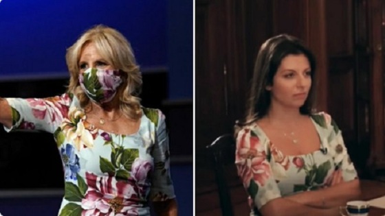 Главный редактор телеканала RT Маргарита Симоньян сыронизировала о «вмешательстве» в американские выборы после того, как жена кандидата в президенты США Джо Байдена Джилл пришла на дебаты в Нэшвилле в том же платье, в котором главред RT брала интервью у главы МИД Сергея Лаврова.