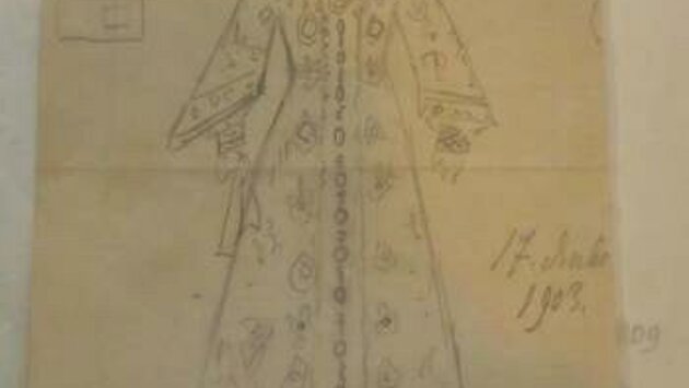 Также на эскизе изображен широкий воротник бармы и головной убор — конусообразная тулья с меховым околышем. Под платно обычно надевалась нижняя женская рубаха: ее украшенные зарукавья (расшитые нарукавники) можно увидеть на рисунке. На обратной стороне наброска есть загадочная неразборчивая надпись на английском языке, оставленная одной из сестер.