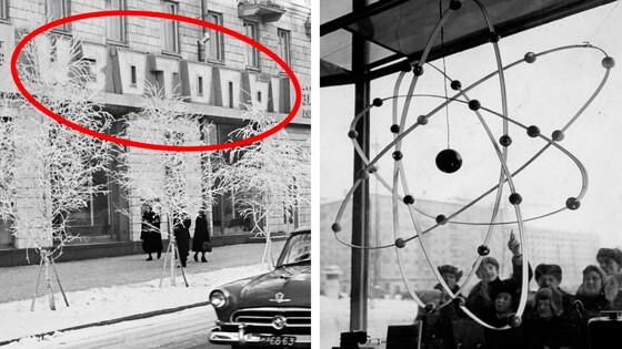 Магазин этот был расположен по дороге к центру Москвы, на Ленинском проспекте. На крыше дома находилась огромная неоновая реклама с четырехцветным изображением атома и надписями на трех языках: «Atome pour la paix», «Атом для мира», «Atom for peace».