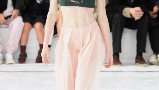 Брюки с экстремально низкой посадкой, юбки-ремни и потертая кожа на показе Miu Miu