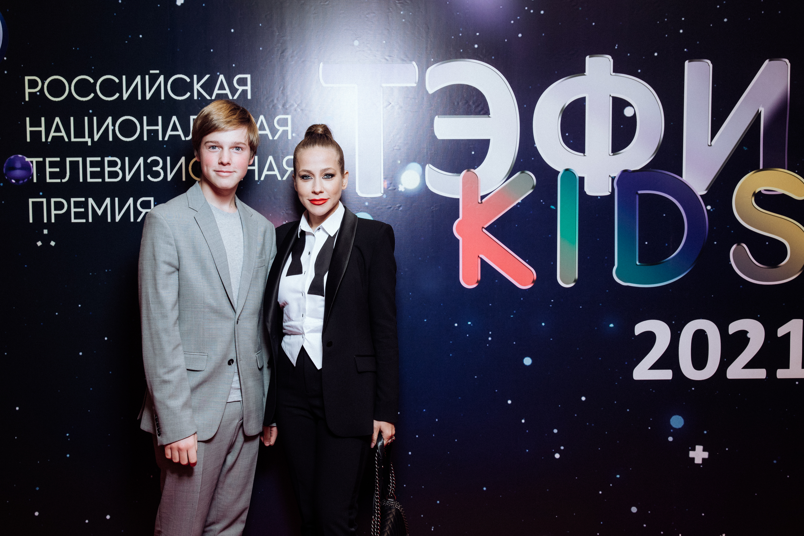 На премии ТЭФИ-KIDS Юлия Барановская появилась в брючном костюме с мужского плеча и со спущенной бабочкой. Добавить дерзости телеведущая решила с помощью красной помады, угольно-черных стрелок и идеального высокого пучка. Вместе с ней перед камерами позировал ее сын Артем Аршавин, который также вышел в свет в классическом костюме.