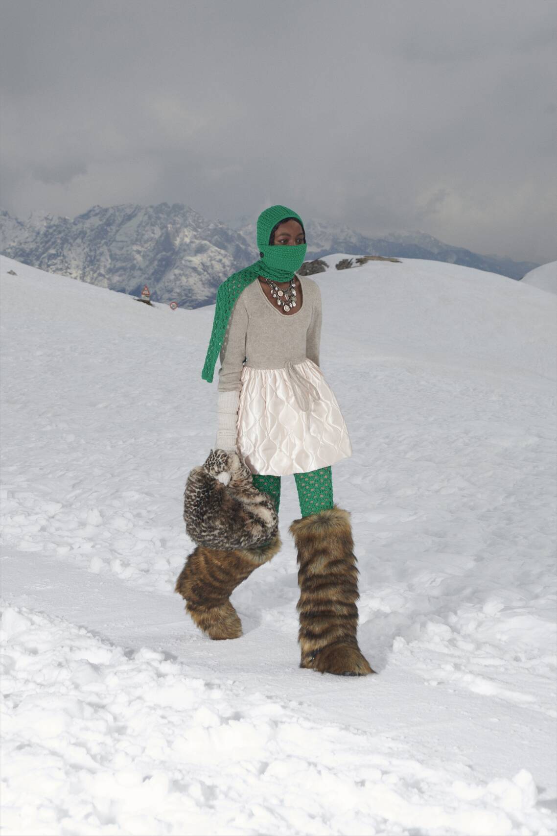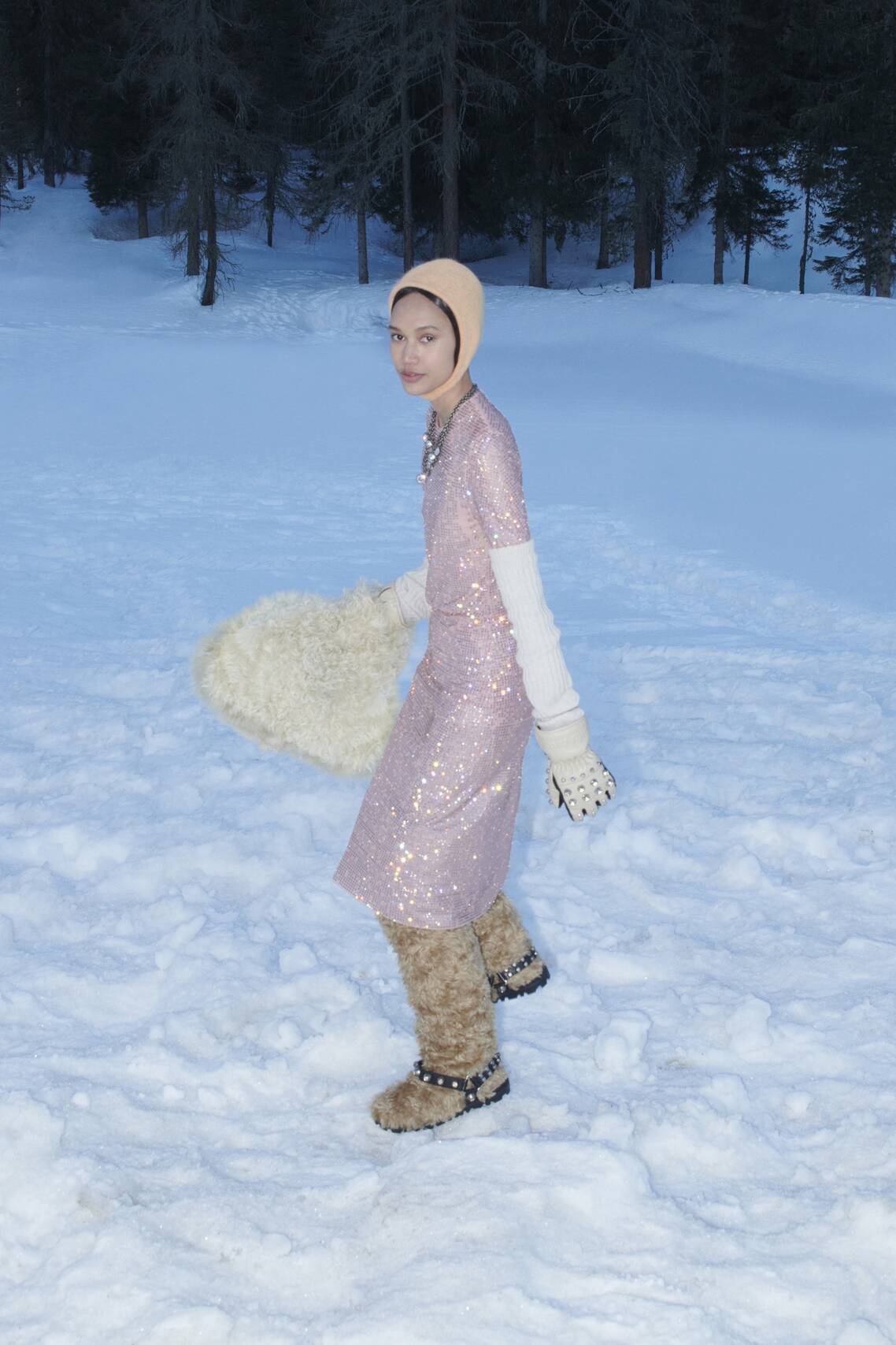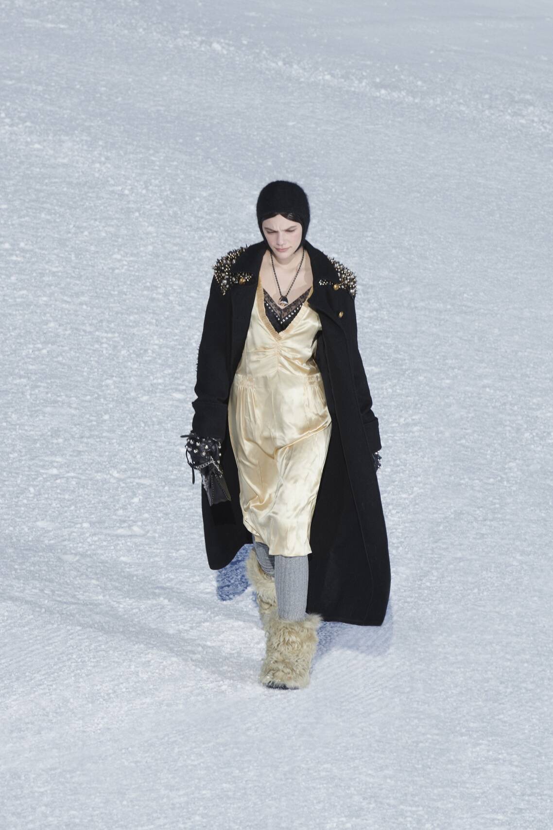 Показ Miu Miu Fall 2021, как и все последние шоу Дома, стилизовала Лотта Волкова. Сапожки-Йетти она порекомендовала носить с мерцающими юбками и топами из крепдешина, колье и соблазнительными атласными комбинациями. А чтобы еще чуть утеплить образ, предложила дополнять его вязаным капором.