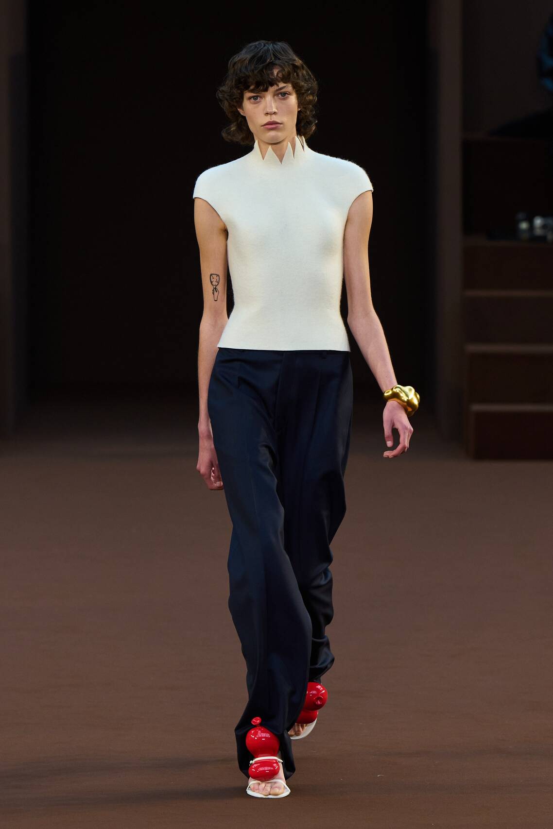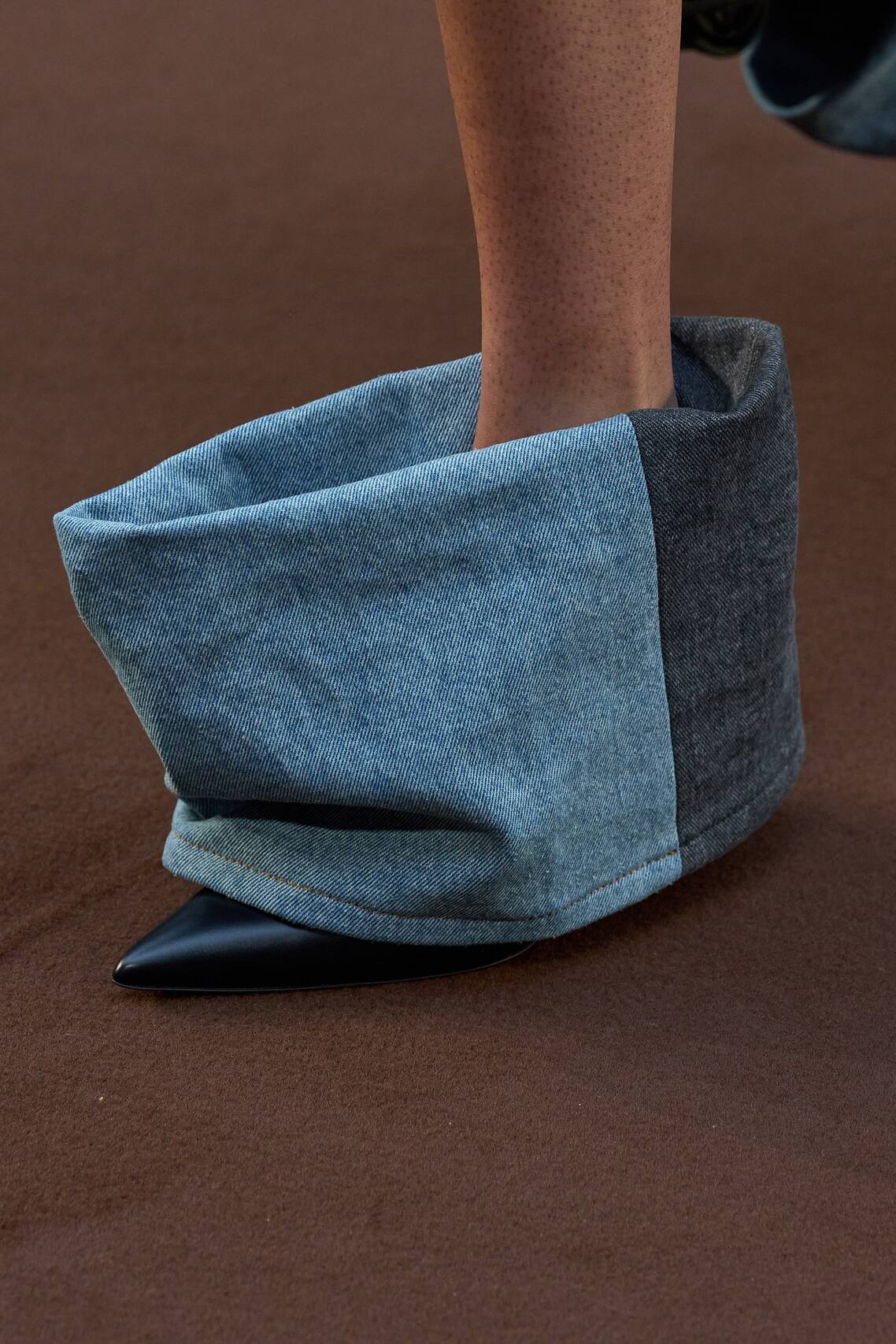Обувь на моделях дополняла сюрреалистическое настроение всего шоу: босоножки с огромными бантами цвета фольги, полусапоги с широким голенищем из джинсы и массивные ботинки на застежках. Из практичной обуви стоит отметить «потертые» кеды, которые уже образовали тренд текущего и будущего сезонов.