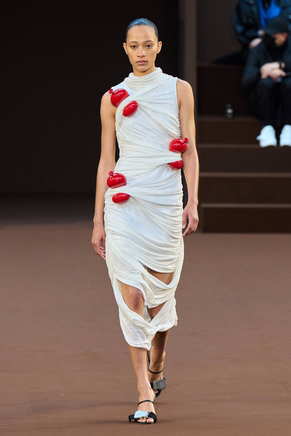 Оригинальной деталью новой коллекции стала имитация воздушных шаров. Они были использованы как бюстгальтеры, надетые поверх длинных струящихся платьев с принтами женской фигуры, а также как каблуки для туфель. Красные и бежевые шарики как бы застряли в драпировке облегающих фигуру платьев. Эпатажные образы продолжались нарядами в виде платьев сеток, внутри которых лежали туфли на шпильке. В коллекции были также представлены смелые сочетания прозрачных топов с меховыми юбками.