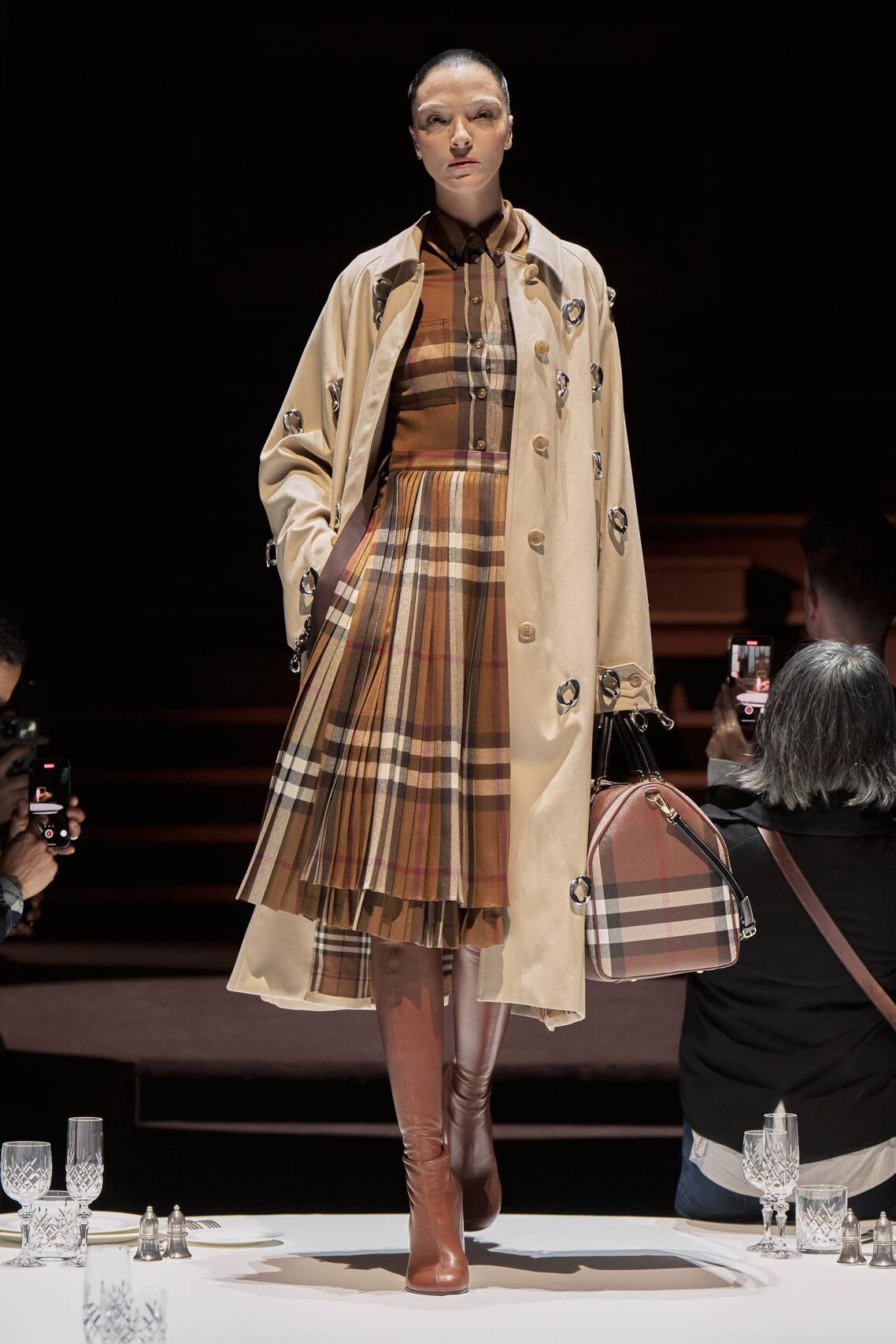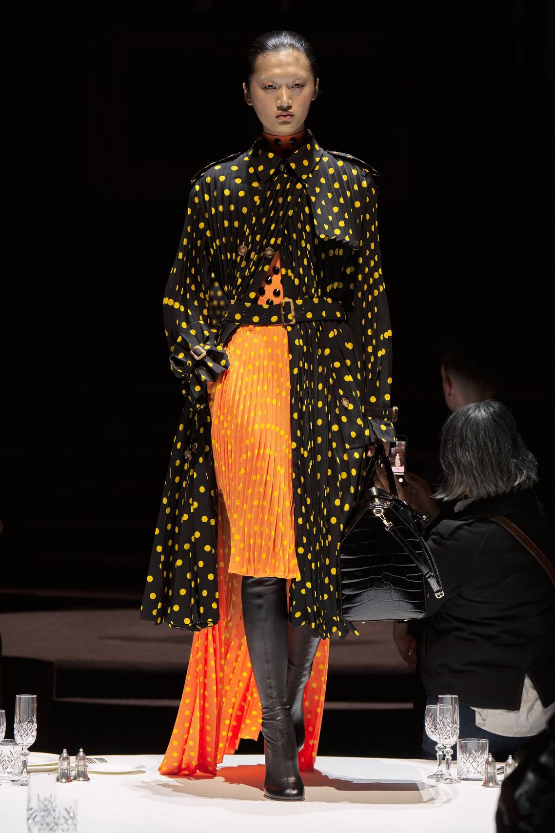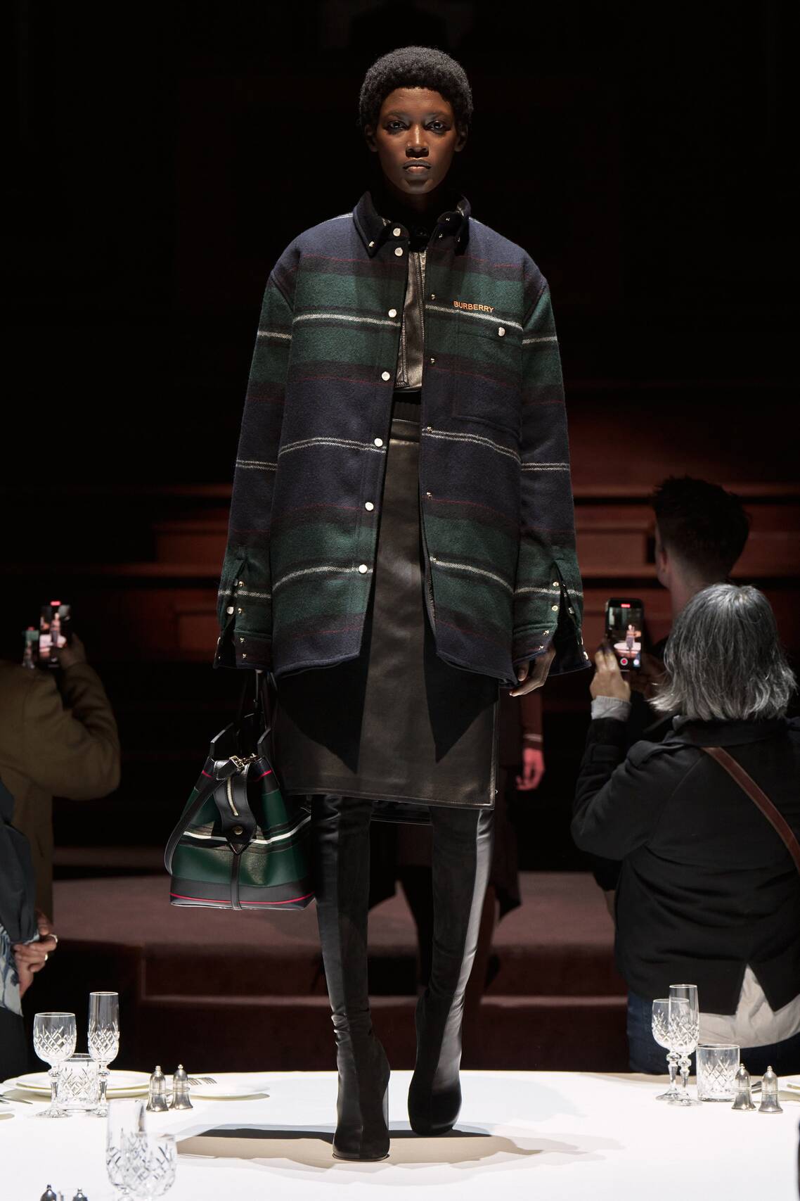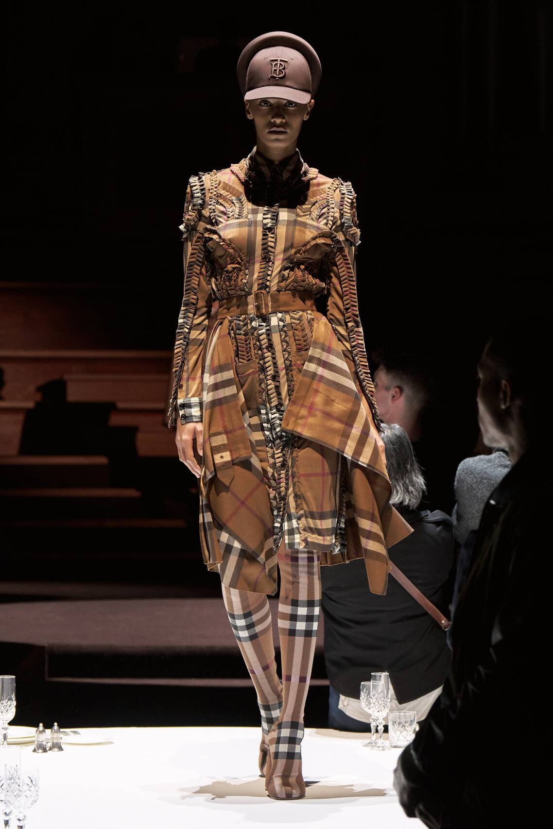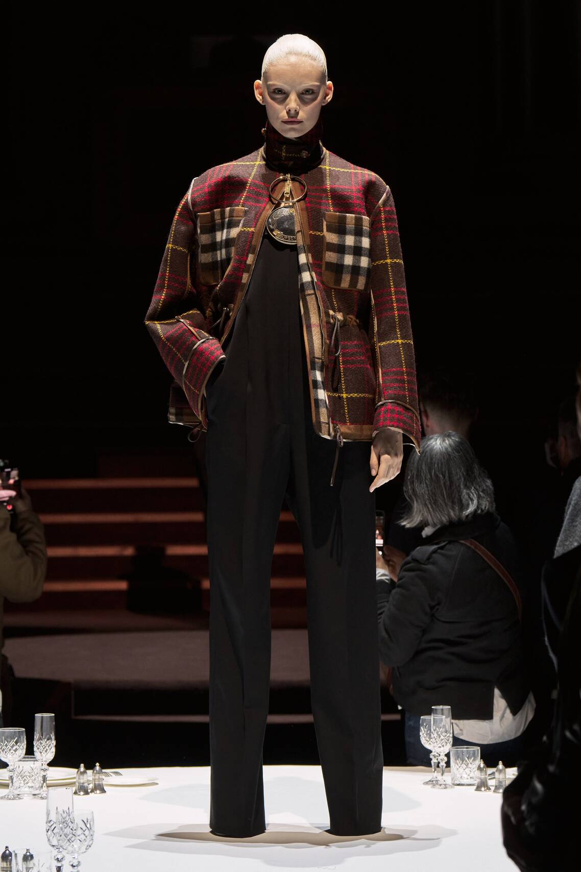 Коллекция получилось очень разнообразной — она сочетала в себе традиционный клетчатый принт Burberry, а также новые силуэты в виде обтягивающих боди и цветных комбинезонов. Модели также продемонстрировали черно-зеленую клетку, наряды в красный и желтый горошек, длинные меховые платья в пол и яркие зеленые пиджаки. Аксессуары в виде доспехов и серебряные вставки на одежде гармонировали с сервировкой подиума.