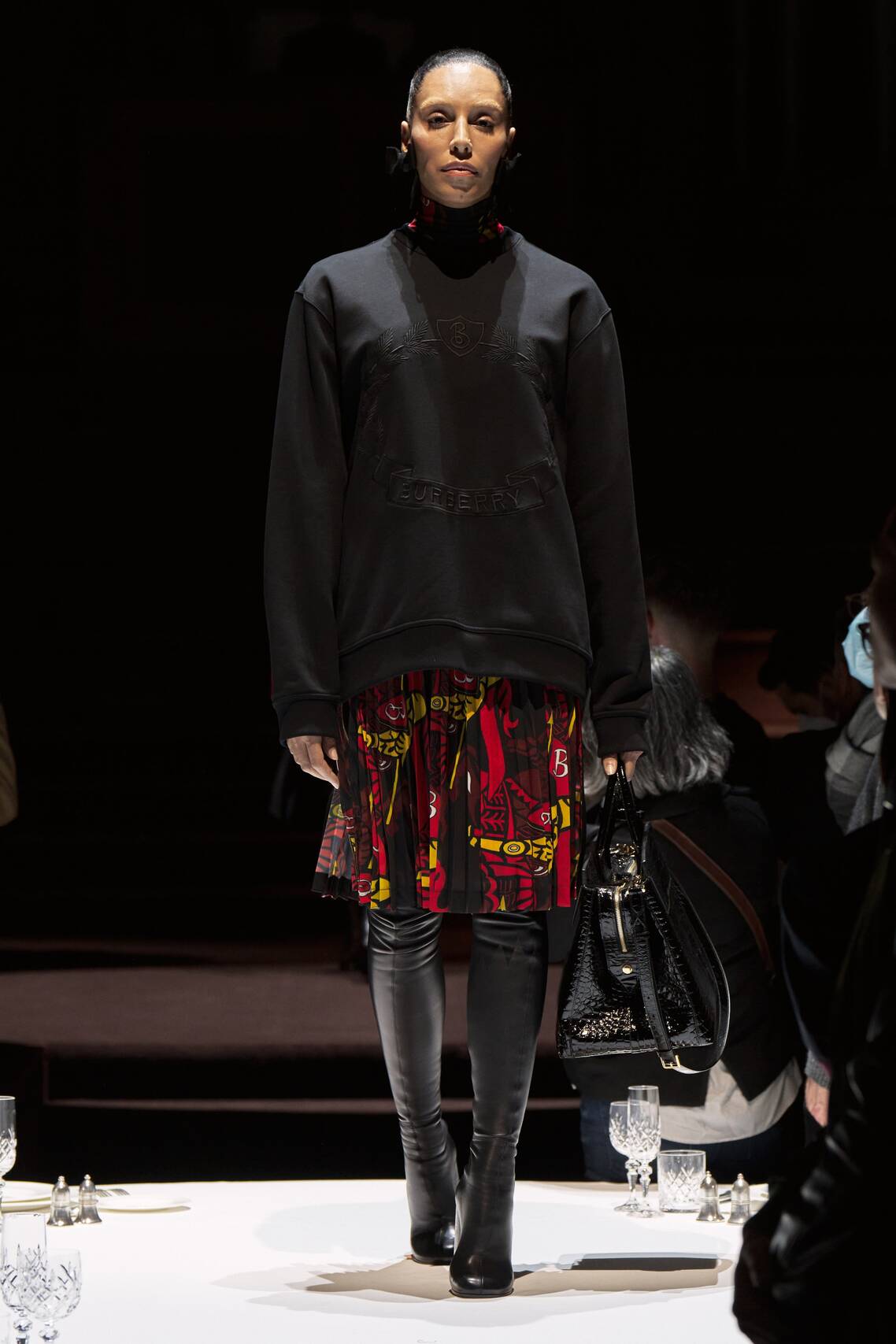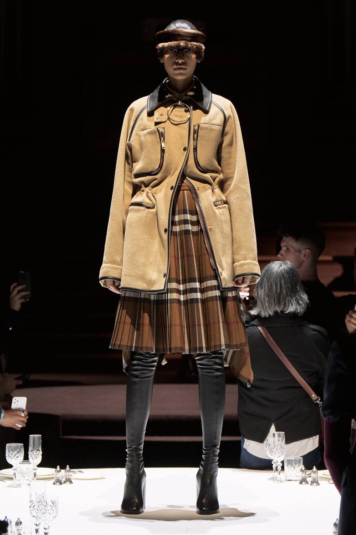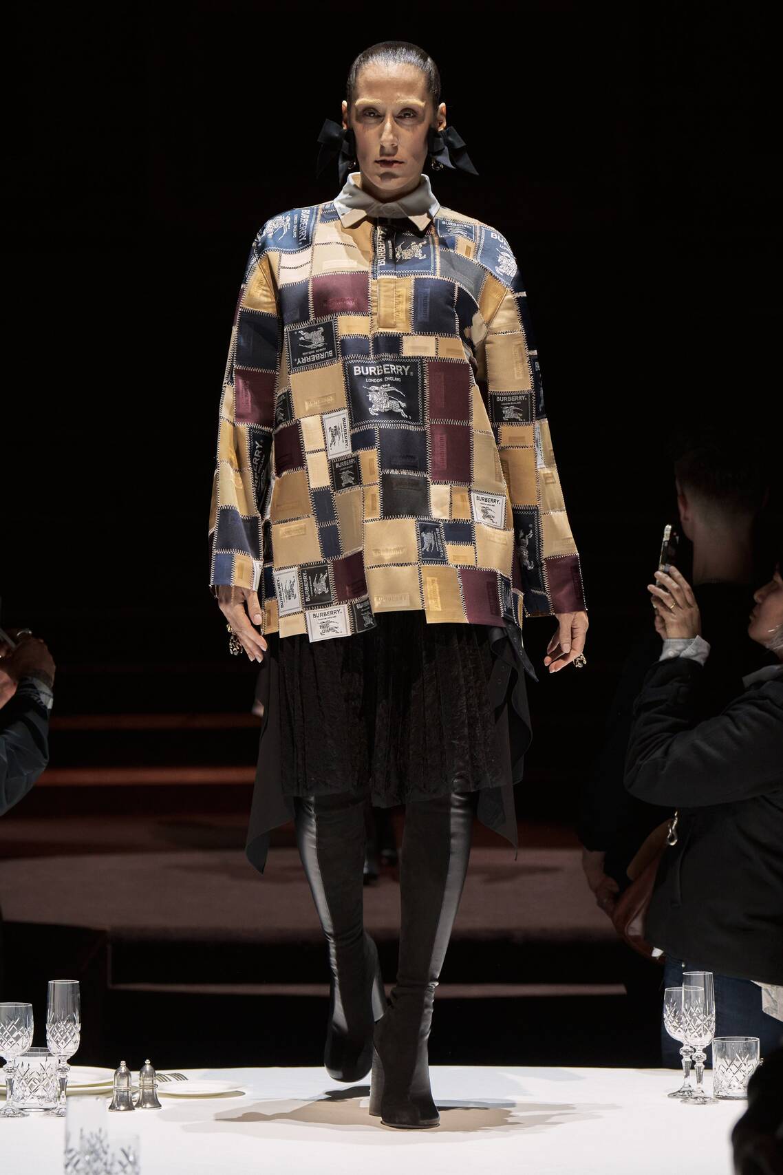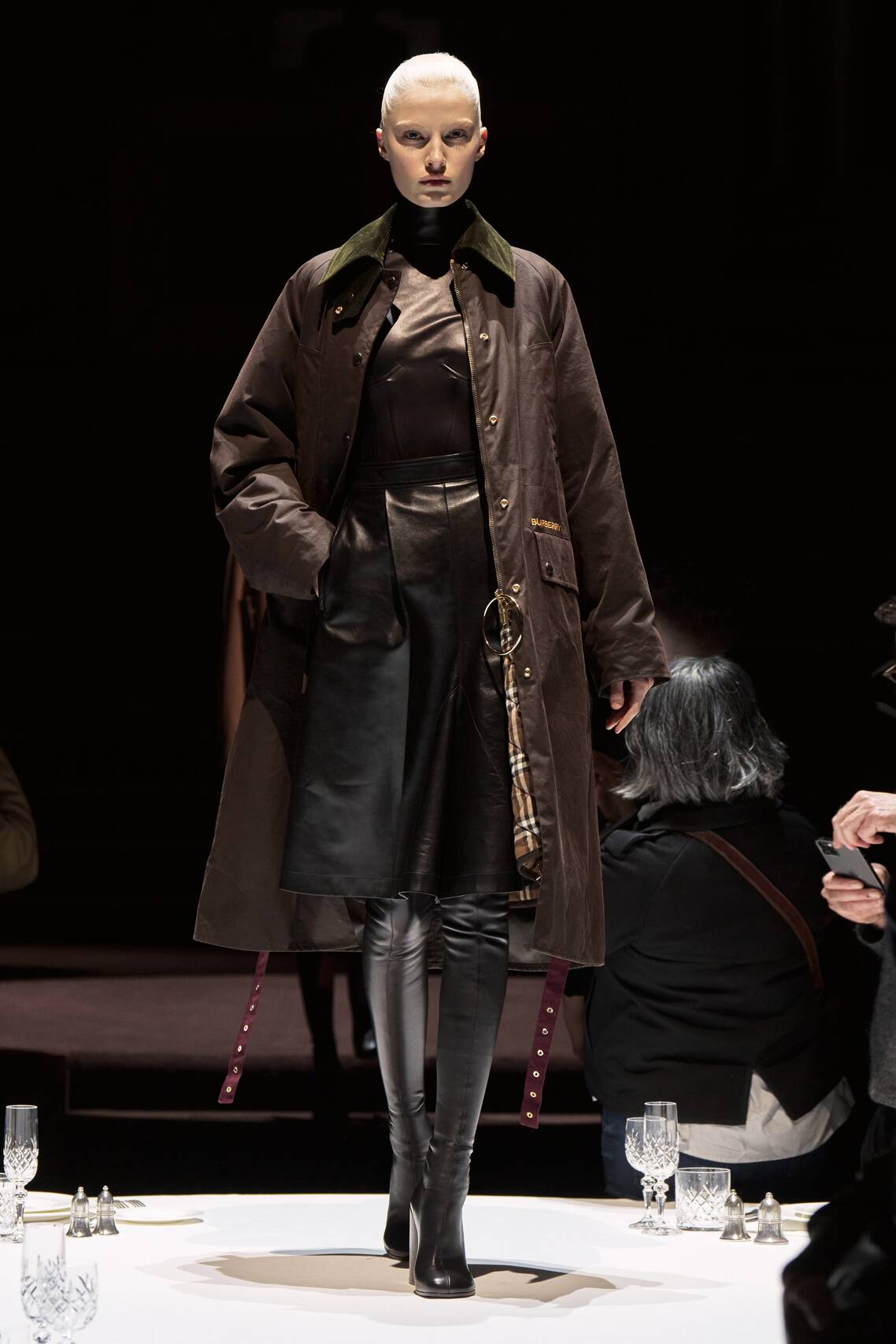 Коллекция получилось очень разнообразной — она сочетала в себе традиционный клетчатый принт Burberry, а также новые силуэты в виде обтягивающих боди и цветных комбинезонов. Модели также продемонстрировали черно-зеленую клетку, наряды в красный и желтый горошек, длинные меховые платья в пол и яркие зеленые пиджаки. Аксессуары в виде доспехов и серебряные вставки на одежде гармонировали с сервировкой подиума.