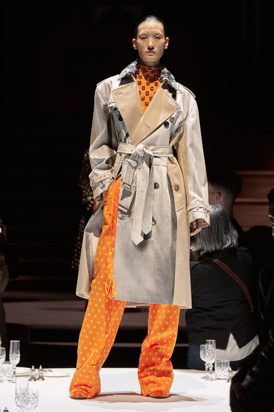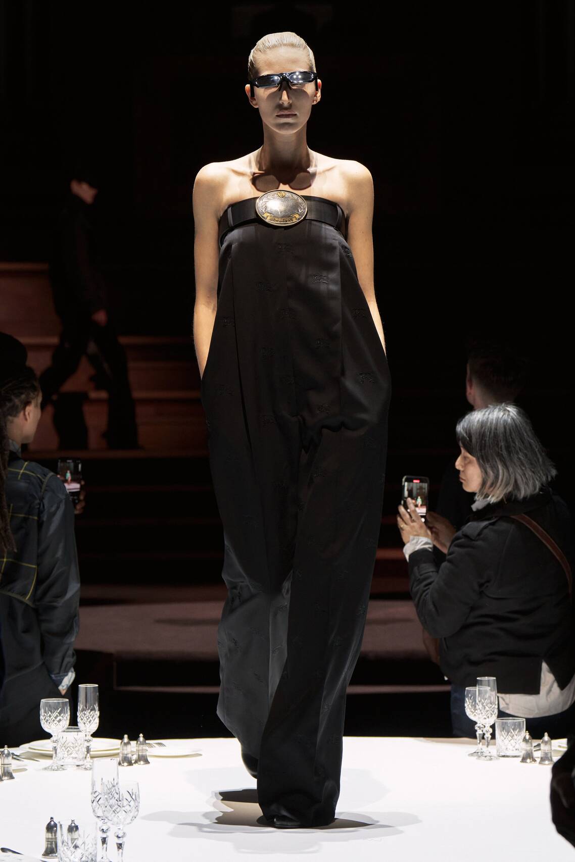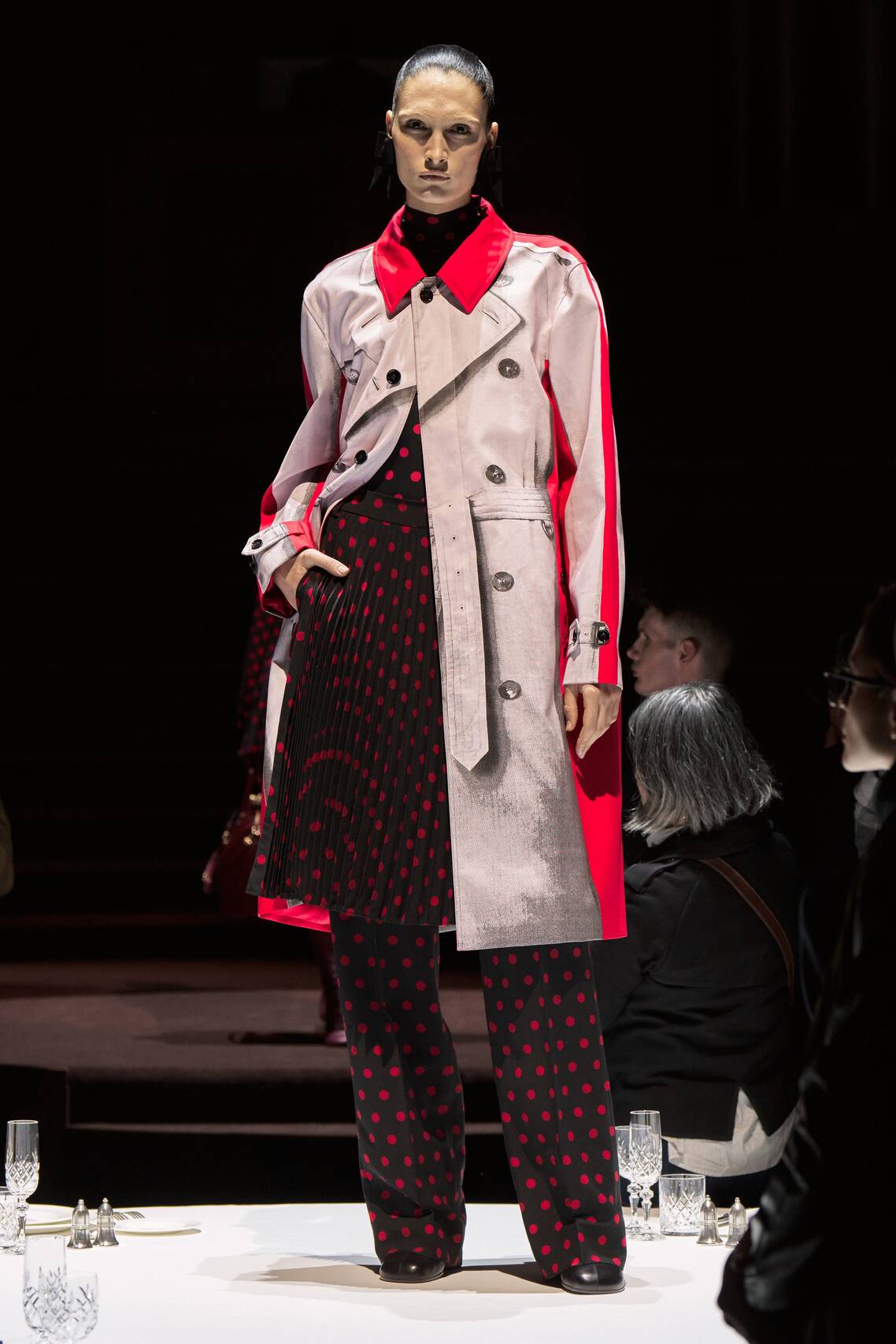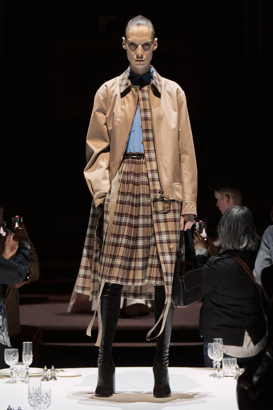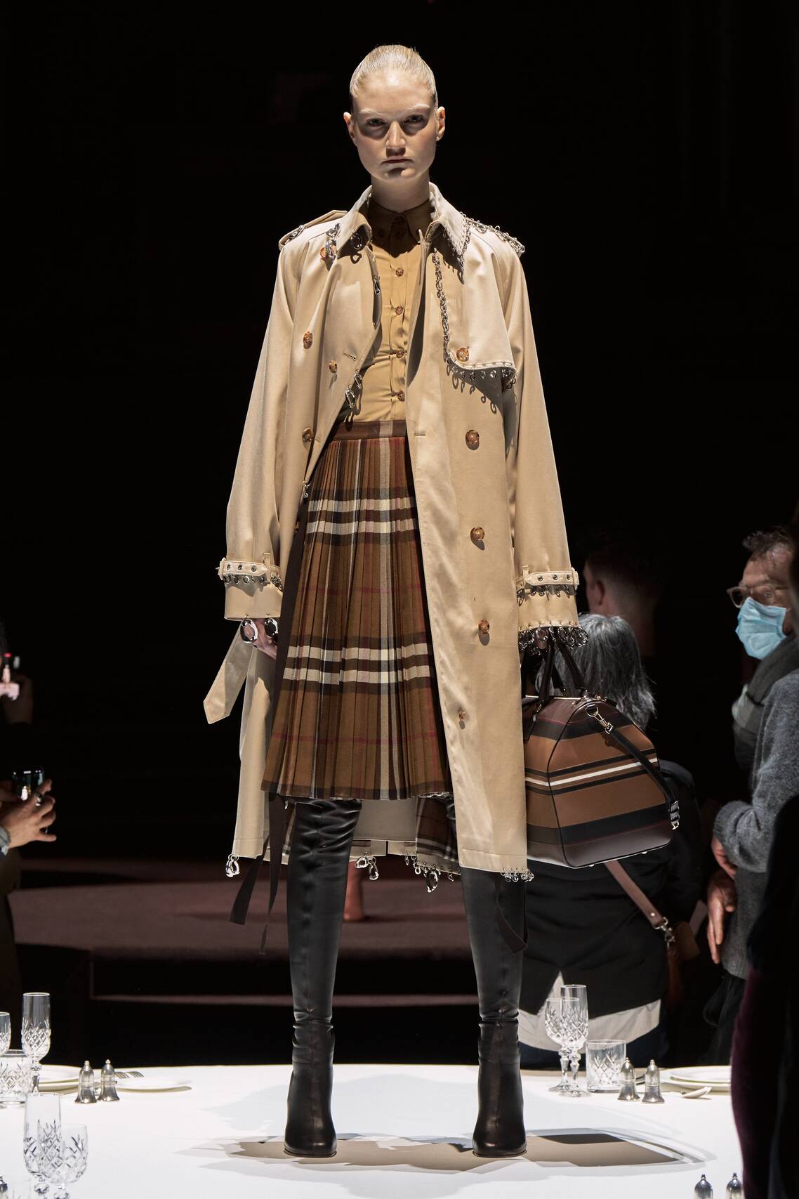 Коллекция получилось очень разнообразной — она сочетала в себе традиционный клетчатый принт Burberry, а также новые силуэты в виде обтягивающих боди и цветных комбинезонов. Модели также продемонстрировали черно-зеленую клетку, наряды в красный и желтый горошек, длинные меховые платья в пол и яркие зеленые пиджаки. Аксессуары в виде доспехов и серебряные вставки на одежде гармонировали с сервировкой подиума.