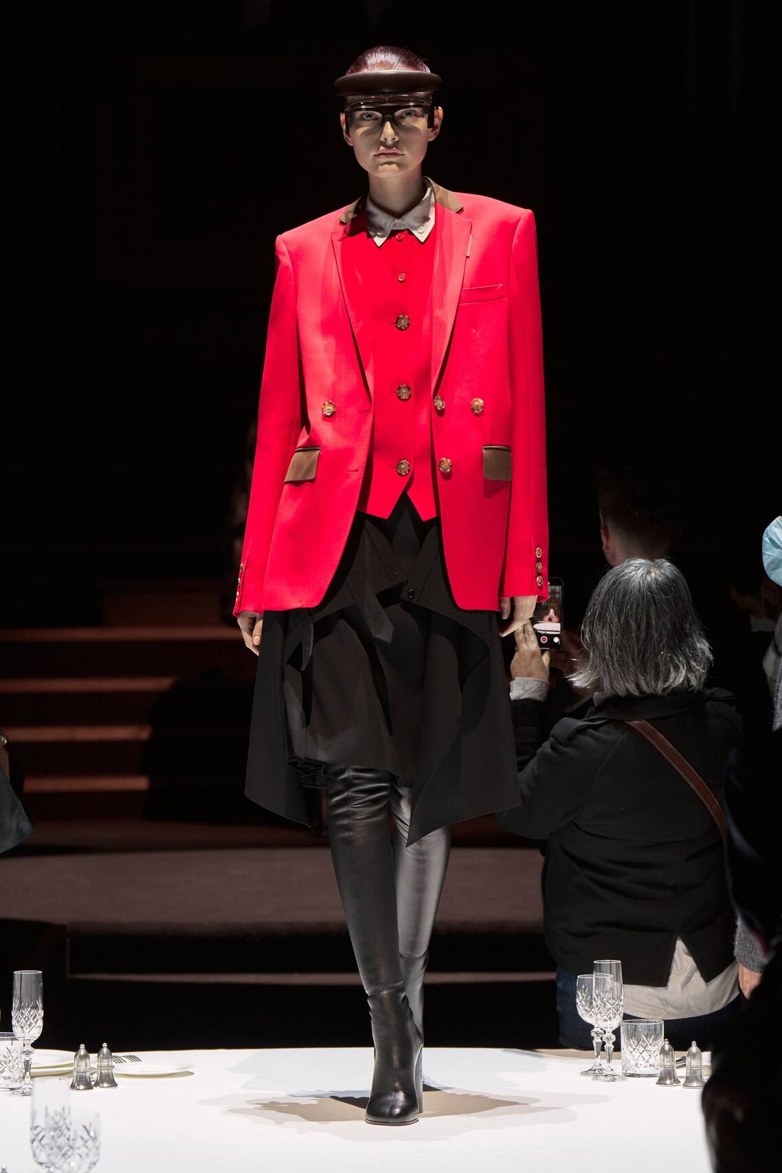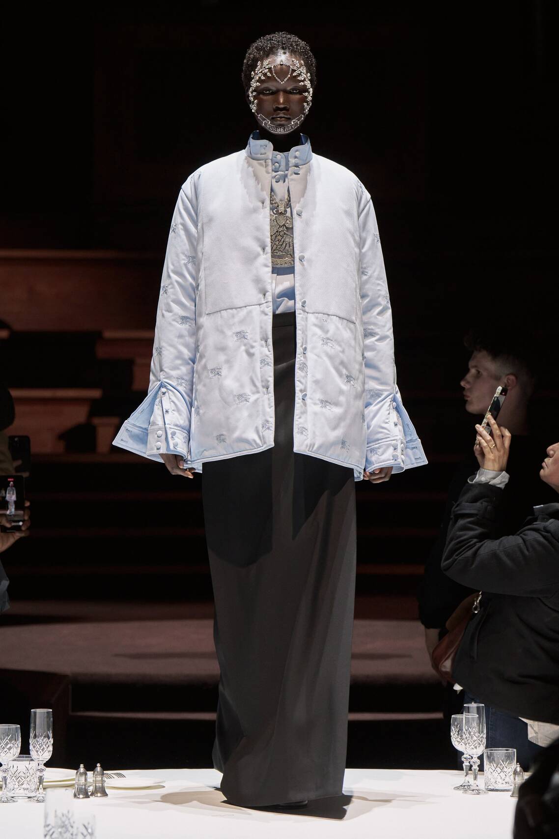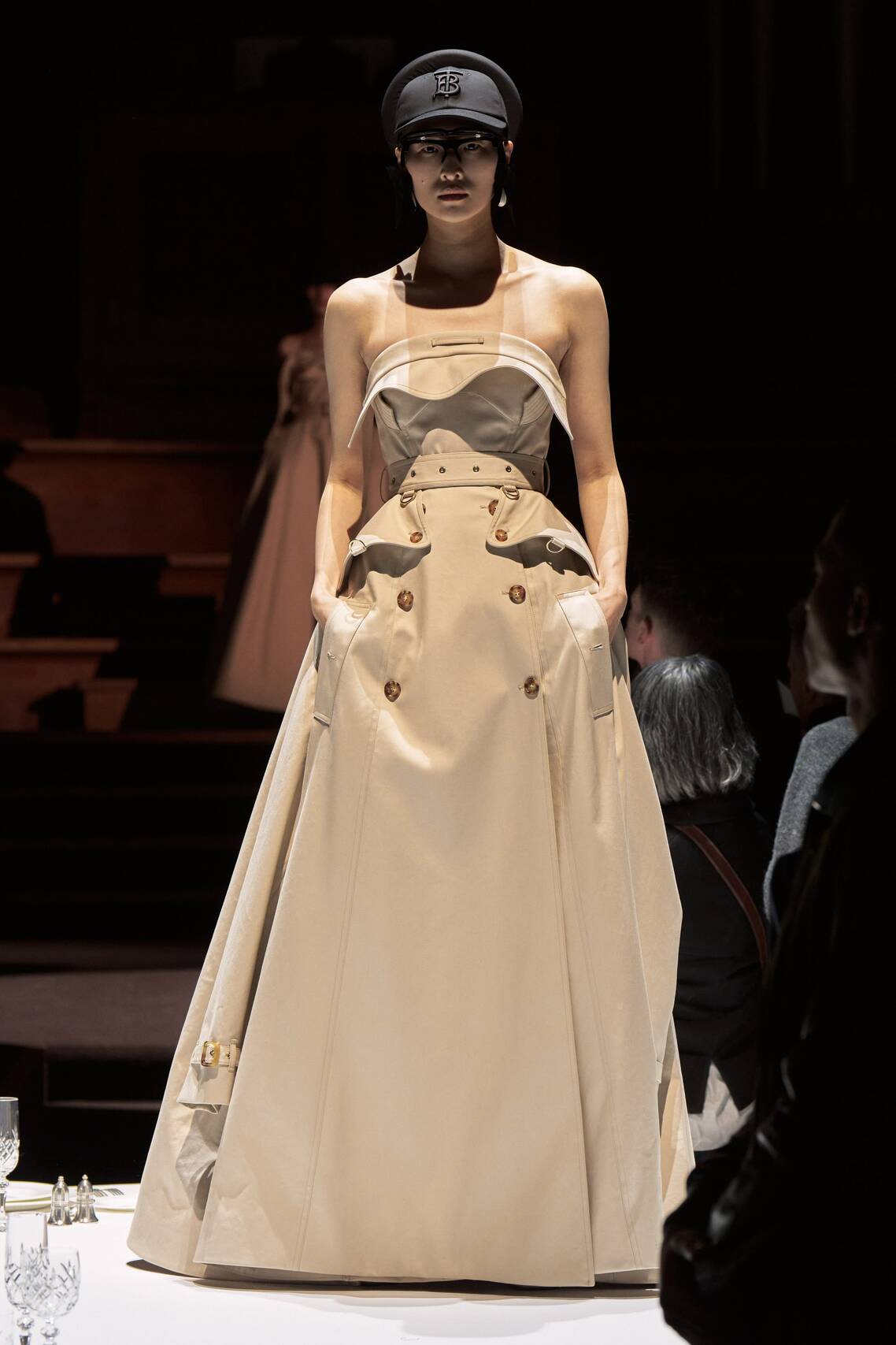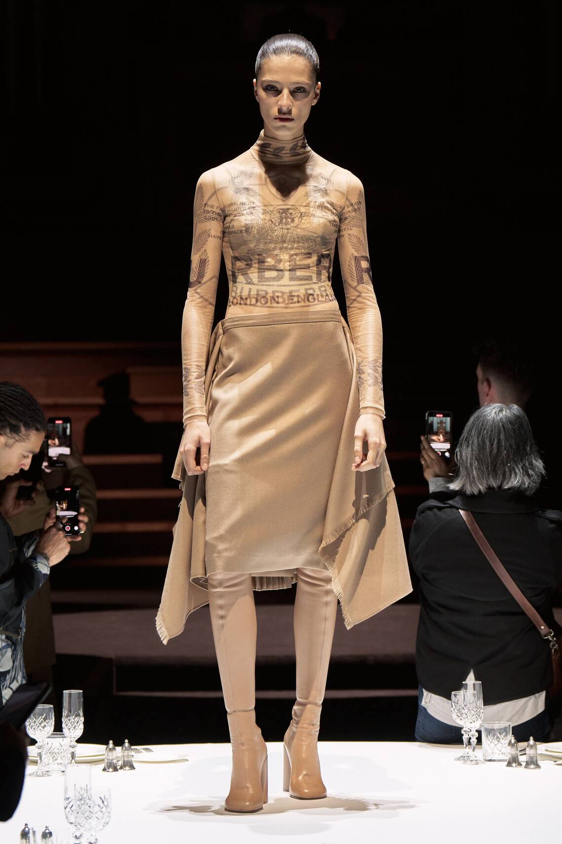 Коллекция получилось очень разнообразной — она сочетала в себе традиционный клетчатый принт Burberry, а также новые силуэты в виде обтягивающих боди и цветных комбинезонов. Модели также продемонстрировали черно-зеленую клетку, наряды в красный и желтый горошек, длинные меховые платья в пол и яркие зеленые пиджаки. Аксессуары в виде доспехов и серебряные вставки на одежде гармонировали с сервировкой подиума.