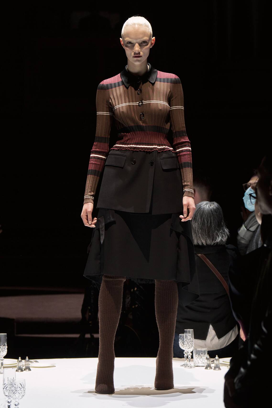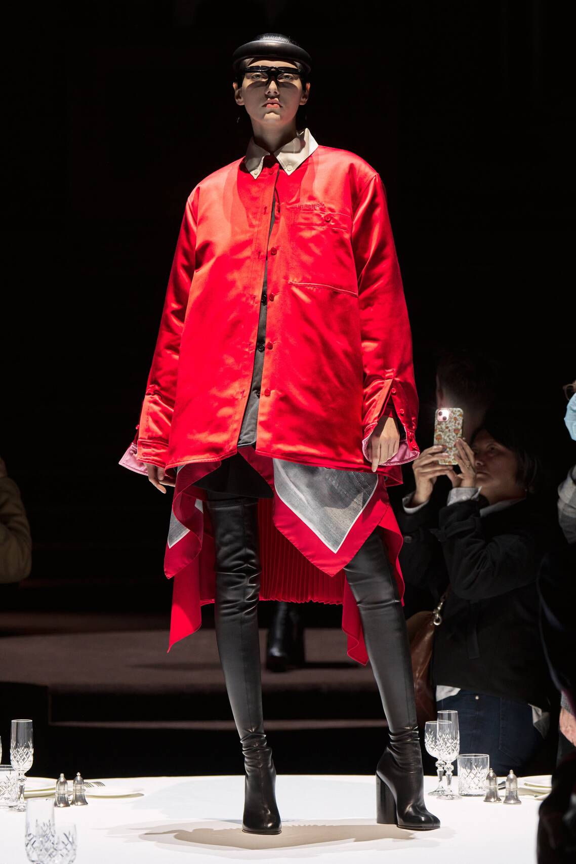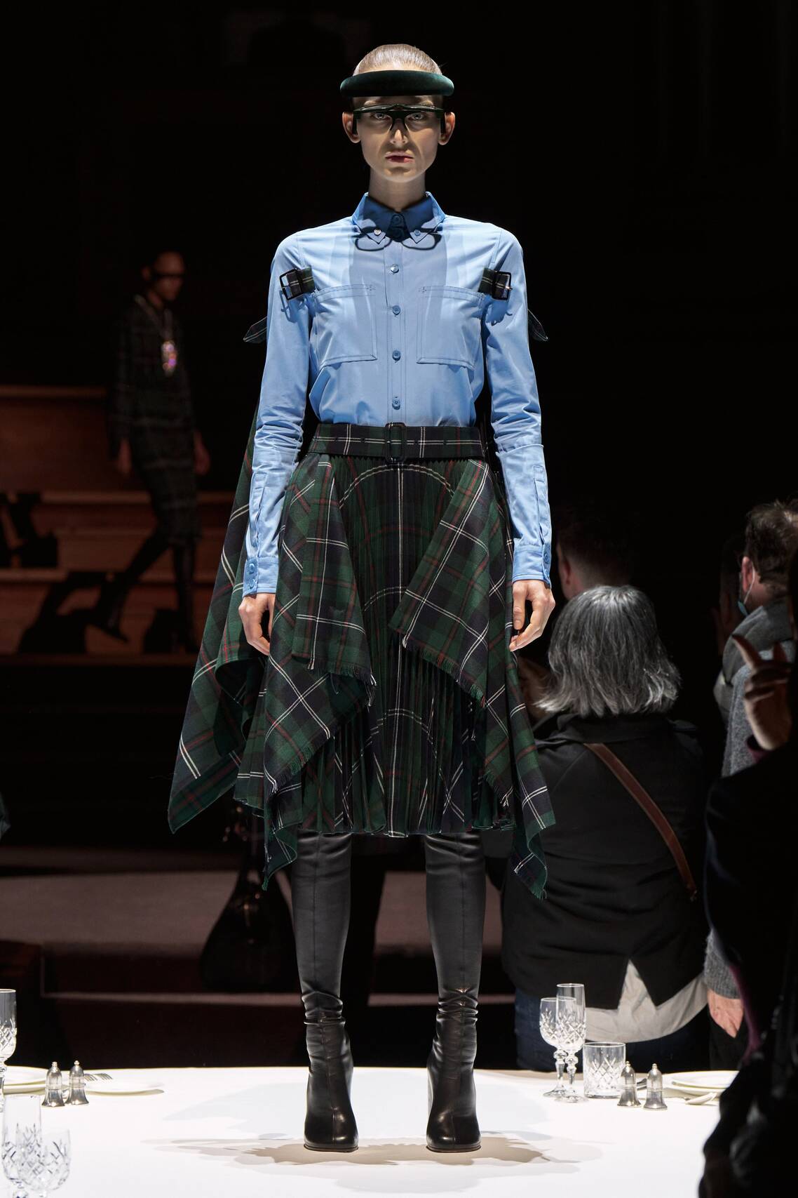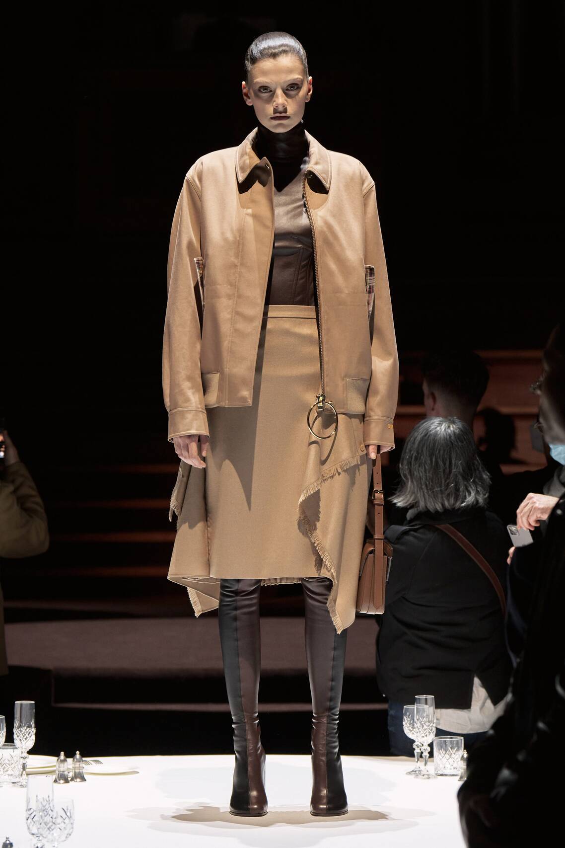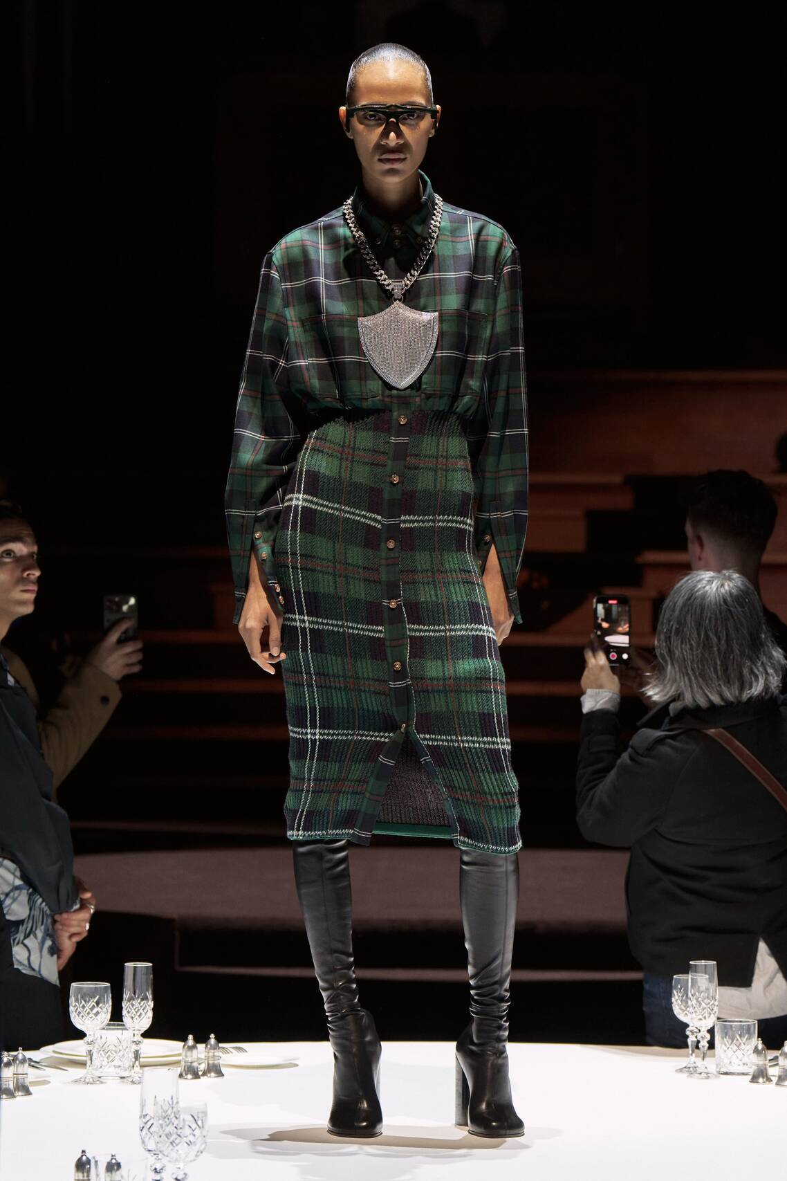 Коллекция получилось очень разнообразной — она сочетала в себе традиционный клетчатый принт Burberry, а также новые силуэты в виде обтягивающих боди и цветных комбинезонов. Модели также продемонстрировали черно-зеленую клетку, наряды в красный и желтый горошек, длинные меховые платья в пол и яркие зеленые пиджаки. Аксессуары в виде доспехов и серебряные вставки на одежде гармонировали с сервировкой подиума.