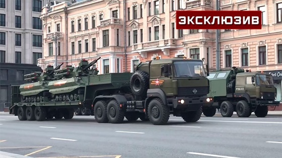 В Москве прошла первая ночная репетиция парада в честь 77-летия окончания Великой Отечественной войны. На кадрах — колонна из 131 образца военной техники, которая проехала по улицам столицы. На Красной площади собралось 33 парадных расчета общей численностью более 10 тысяч военнослужащих из частей ЗВО, а также курсанты военных училищ.
