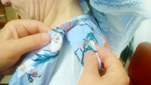 Первая модель была разработана по просьбе Марины Сергеевны, проживающей в отделении милосердия. Для нее специалисты учреждения организовали пошив платья – рубашки с учетом физических особенностей женщины: у нее контрактура левой руки.