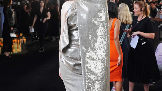 На этой неделе в Лондоне актриса пришла на премьеру своего последнего блокбастера —адаптации Netflix любимого комикса Нила Геймана «Песочный человек», в котором она играет Люцифера. Актриса явно была готова к драме, выбрав эффектное платье Rick Owens из его футуристической и немного апокалиптической коллекции сезона осень-зима 2022. Топ дополнялся эффектным рукавом-вставкой от плеча до колена, украшенным серебряными блёстками, достойными любого гламурного космического воина. С типичным для Рика Оуэнса нестандартным подходом к сочетанию фактур юбка длиной до пола была сшита из денима в расцветке омбре, который менял цвет от серебристого к классическому джинсовому серому.