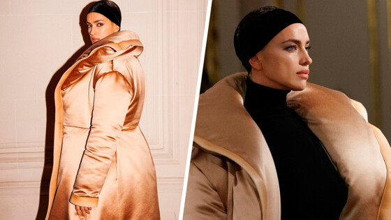 На Ирине Шейк был надет черный обтягивающий комбинезон, объемный пуховик с золотым отливом, черные сапоги на невысоком каблуке. В качестве аксессуара была использована черная повязка на голове.