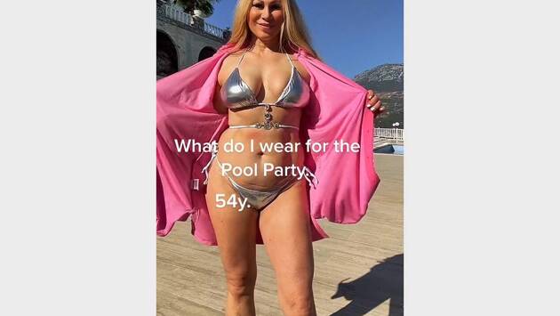 Вначале на размещенных кадрах 54-летняя юзерша с моложавой внешностью предстала на отдыхе в розовом халате выше колена и с распущенными волосами оттенка блонд. «Что мне надеть на вечеринку у бассейна?» — поинтересовалась она. Затем женщина распахнула одежду, показав тело в серебристом купальнике, который состоял из топа с треугольными чашками и трусов с низкой посадкой и был украшен блестящими камнями.