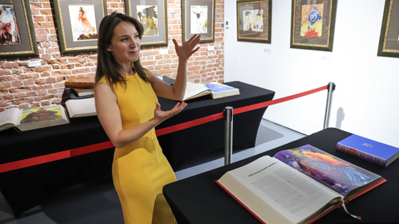 «Здесь представлены священные книги, в которых содержатся фактурные иллюстрации Сальвадора Дали. Их можно полистать, посмотреть, одна из них на русском языке. Всего представлено пять томов», — рассказала про одну из частей экспозиции арт-менеджер «Главного проспекта» Елена Жирова.