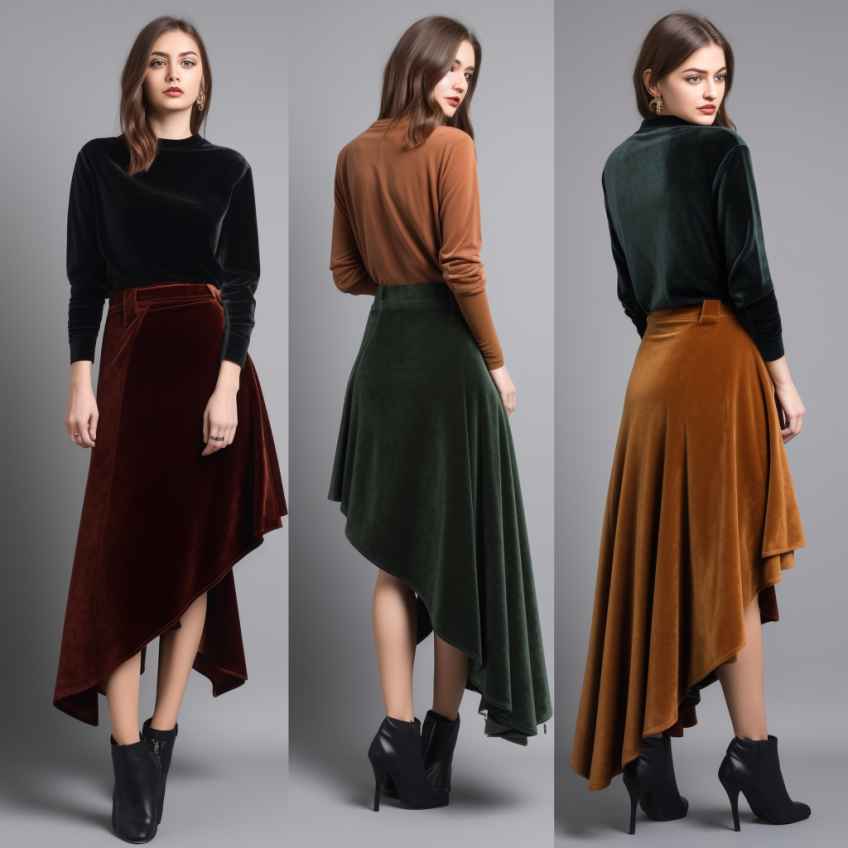 В 2023-2024 году трендовыми считаются модели, которым придаются выразительные детали. Примером служит юбка с асимметрией, создающейся за счет неравномерной длины подола. Встречаются варианты с перепадами в боковых частях. Другое решение – передняя часть, которая создается более укороченной по сравнению с задней.