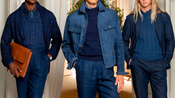 В первой представлены комфортные костюмы из смеси хлопка и льна цвета индиго, рубашки из шамбре и фактурный трикотаж. Для любителей более своеобразных образов есть замшевые куртки в рабочем стиле, а ещё лёгкие джинсовые шорты, костюмы в меловую полоску, смокинг с воротником с милым цветочным принтом и даже халат с аккуратным вышитым логотипом знаменитого бренда на кармане. Вторая линия выполнена в коричнево-кремовых оттенках, где есть спортивные пальто на каждый день из натурального шёлка, льна и кашемира, рубашки из итальянского поплина, байкерские куртки из полированной овечьей кожи и замшевые куртки без подкладки. И даже свитеры ручной вязки!