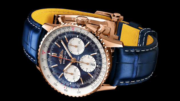 Циферблат часов выполнен из синего перламутра, украшен контрастными белыми циферблатами и дополнен индексами и стрелками из красного золота. Часовой механизм, который виден через открытую заднюю крышку корпуса, оснащен собственным калибром Breitling 01 с автоподзаводом, который показывает часы, минуты, секунды, даты и выполняет функцию хронографа и имеет запас хода на 70 часов.