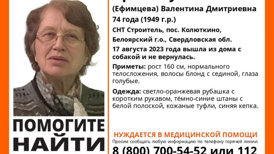 В поселке Колюткино Белоярского городского округа Свердловской области пропала 74-летняя Валентина Артемчук. Женщина вышла из дома с собакой 17 августа. Об этом сообщили в поисковом отряде «ЛизаАлерт».