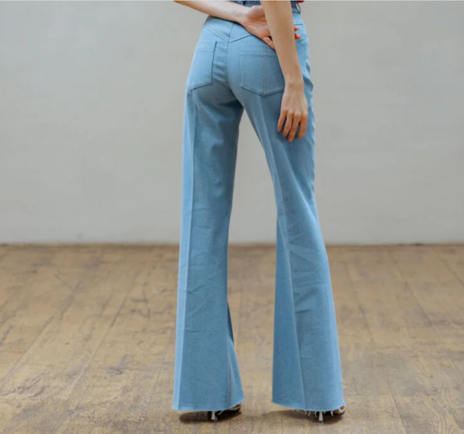 Как рассказала дизайнер российского бренда STiMAGE Наталья Мейер, джинсы клеш удлиняют ноги и делают фигуру более женственной. Так в коллекции этого бренда есть синие и голубые модели.
