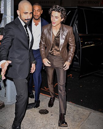 Звезда «Дюны» вышел на прогулку по Нью-Йорку в приталенном кожаном пиджаке и узких штанах коричневого цвета. На нем были также надеты шелковая рубашка в тон и темно-бордовые ботинки.
