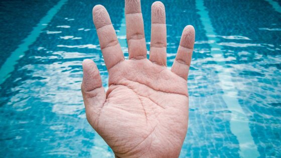 СодержаниеРасширение верхнего слоя кожиСморщивание кожи в воде как рефлексРеакция кожи как результат эволюцииДлительный контакт кожи с водой и его опасность для здоровьяСморщенная кожа и гиперкератоз Довольно часто, выходя из ванны или бассейна, а также возвращаясь на берег после длительного пребывания в морской воде, мы замечаем, что кожа на пальцах рук и ног, а иногда на ладонях и стопах целиком, становится морщинистой. Ладонь с крупными складками практически белого цвета выглядит, как рука мудрого старца, но через определенное время все само собой проходит и исчезает без следа. Еще с детства мы привыкли, что подобное явление объясняется простой фразой «кожа распарена», и даже не задумываемся, а действительно ли это так. Ученые же пытаются определить причину данного феномена уже не одно десятилетие. И на сегодняшний день существует несколько теорий появления морщинистой кожи на ладонях и стопах после контакта с водой. MedAboutMe расскажет вам, какие версии взаимодействия кожи с водой рассматриваются специалистами и представляет ли подобный контакт какую-либо опасность для здоровья. Расширение верхнего слоя кожи Данная теория является самой распространенной. Верхний слой кожи на ступнях и ладонях покрыт белком кератином, впитывающим влагу при длительном контакте с ней. В результате такого взаимодействия эпидермис расширяется и сморщивается. Различные по величине складки появляются из-за того, что верхний слой кожи в размерах увеличивается, а нижние слои остаются неизменными, и образование морщин позволяет компенсировать объем разбухших тканей. Локальное сморщивание кожи объясняется тем, что эпидермис на пальцах рук и ног, стопах и ладонях более толстый, чем на остальных участках тела. В нем содержится больше кератина и, соответственно, влага им впитывается гораздо активнее. Сморщивание кожи в воде как рефлекс Еще в 1935 году специалисты отметили, что у людей с определенными поражениями нервной системы кожа на пальцах рук и ног после длительного пребывания в воде не сморщивается. Соответственно, причина такого явления может быть неврологической. Ученые считают, что за сморщивание кожи отвечают конкретные нервные окончания, и если их «отключить», данное явление наблюдаться не будет. После такого открытия звучали даже предложения проверять подобным образом работу симпатической нервной системы у тех пациентов, у которых реакция на другие воздействия отсутствовала. Предположив механизм сморщивания кожи, осталось разобраться, для чего нужна организму такая реакция. Но и на этот вопрос ученые уже подготовили ответ, выдвинув следующую теорию. Реакция кожи как результат эволюции Самая свежая теория, объясняющая причины сморщивания кожи в воде, связана с эволюционными механизмами. Согласно ей, нашим далеким предкам часто приходилось добывать из рек и других водоемов не только пищу, но и то, что может пригодиться в быту. Поскольку специальных орудий еще не было, делали они это голыми руками. Соответственно, сморщивание кожи на ладонях и пальцах рук в разы облегчало данную задачу, а изменение покрова на ступнях упрощало перемещение по подводным камням и другим скользким поверхностям. Таким образом, создатели подобной эволюционной теории утверждают, что сморщивание кожи на пальцах рук и ног предназначено для лучшего сц
