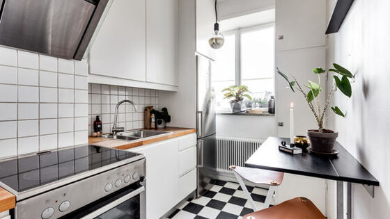 В чем сложностьМинимальная площадь кухни, допускаемая нормативом для однокомнатных квартир — 5 кв.м. В квартирах большего размера согласно СП 54.13330 кухня должна быть уже не меньше 8 кв.м. Разве восьми метров мало для полноценной кухни с обеденным столом? В принципе нет, если речь о комнате правильной формы: прямоугольника, тяготеющего к квадрату. А если речь об узком помещении, где восемь метров вытянуты пульмановским вагоном? И размещение мебели привязано уже не только к коммуникациям и стояку вентиляции, но и диктуется положением окна, балконной двери и входом на кухню. Нюансы перепланировкиПлощадь. Довольно много домов сдаются в так называемой свободной планировке, когда положение стен только намечено застройщиком на плане и велик соблазн не поставить какие-то перегородки во время ремонта. К сожалению, любые изменения вы все равно должны будете согласовать (иначе это считается незаконной перепланировкой). Если в ходе перепланировки кухня все равно выходит узкой, не оставляйте на нее меньше 7 кв.м — иначе просто не поместится все необходимое.Высота помещения. Важный нюанс — подъем пола, например, если вы планируете прокладку коммуникаций и понижение общего уровня. Оказывается, и этот показатель нормируется: чистая высота от пола до потолка должна быть минимум 2,5 метра. В климатических северных подрайонах IА, IБ, IГ, IД и южном IVA — 2,7 метра (смотрите строительную климатологическую карту).Ограничения. Нельзя расширять кухню за счет санузла и жилых комнат — только коридоров и кладовых. СП 54.13330 — один из немногих сводов правил, неисполнение которого влечет за собой административную ответственность. Нарушитель обязан уплатить штраф и вернуть планировку в исходное состояние. Помимо положения кухни важно организовать принудительную вентиляцию (особенно, если вы перенесли кухню). Иначе вместе с запахами придут плесень и грибок, не удивляйтесь.ПО ТЕМЕ…Перепланировка квартиры: Что можно, а что нельзя Размеры. Если не оптимальные, то разумные и достаточные размеры для кухни показаны на схеме. В узкой кухне важнее всего позаботиться о ширине прохода.между кухонной мебелью и столом 1,0–1,2 м;минимальный допустимый размер прохода — 70 см.Увеличивайте схемы ниже — на них схематично показаны ширины прохода и ошибочное / допустимое / правильное расположение техники в узкой кухне. Между любым кухонным оборудованием и плитой должна быть буферная зона размером не меньше 30 см, а лучше — 60 см (см. планы вверху). Когда нет хотя бы небольшой рабочей поверхности рядом с плитой, очень неудобно готовить: некуда положить доску для нарезки или поставить сервировочное блюдо. Если планируете посудомойку, убедитесь, что в соседнем шкафу достаточно места для вывода воды, канализации и монтажа розетки (ее нельзя устанавливать позади посудомойки). При установке посудомойки в угол желательно не делать примыкания к стене. Обязательно запланируйте вставку (как показано на фото), проверьте, чтобы дверца посудомойки открывалась полностью, не задевала угол. Совет: Хлебопечки, стационарные шейкеры, соковыжималки, йогуртницы и другие подарки от родственников и друзей занимают кучу места, требуют подключения к розеткам и неудобны в хранении. Оставляйте технику в маленькой кухне, только если регулярно (чаще двух раз в месяц) ей пользуетесь. В остальных случаях сп