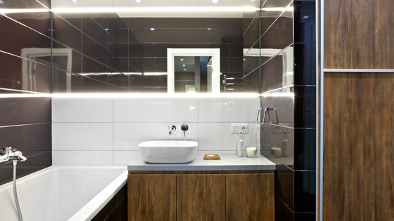 Ванная комната Исходно сантехнические помещения были раздельными (туалет 2 м², ванная 4 м²). Пожеланием хозяина было объединить их. При перепланировке удалось присоединить часть коридора и получить просторную комнату площадью 8 м², где уместились и ванна, и душевая кабина. Заказчик хотел оформить интерьер в стиле минимализм. Была выбрана монохромная цветовая гамма — эффектный контраст чёрного и белого с тёплыми оттенками дерева. Интересная деталь — большое зеркало на всю ширину стены. Оно смонтировано заподлицо с плиткой и подсвечено светодиодной лентой в металлическом профиле. Ректифицированный керамогранит на полу позволил создать бесшовное покрытие, имитирующее бетон. В потолок встроили точечные светильники и осевой вентилятор. За потолочной конструкцией скрыты воздуховоды, выведенные в вентиляционный короб. Ванная комната В минималистском интерьере не должно быть ничего лишнего. Поэтому мы предусмотрели вместительный хозшкаф: рядом с унитазом организовали большую нишу, которую закрыли раздвижными дверцами. Сюда уместились и стиральная машина, и корзина для белья, и полки для хранения мелочей. Ещё один шкаф для средств гигиены (глубиной 15 см) — над унитазом, он утоплен в стену и оснащён дверцами, которые открываются по принципу push-to-open. Умывальник установили на широкую навесную тумбу, изготовленную на заказ. Екатерина Степанова и Максим Трушкин Архитекторы, авторы проекта Ванная комната Технические детали Экспликация 1. Ванна 2. Умывальник 3. Стиральная машина 4. Унитаз 5. Душевая кабина Материалы и оборудование ПОЛ, СТЕНЫ: керамическая плитка Marazzi, краска Benjamin Moore, керамогранит Kerama Marazzi САНТЕХНИКА: душевая стойка, смесители — Kludi, умывальник Melana, поддон для душа Cezares, полотенцесушитель Energy, ванна Riho Площадь ванной комнаты: 8 м2 Экспресс-подбор: выбираем накладную раковину Barselona RC1.5040 (Alvaro BaŇos) Ш × Г × В: 50 × 40 × 13 см. Цена: 4550 руб. Фото: Alvaro Baňos Happy Hour Y0QQ01 (hatria) Ш × Г × В: 55 × 40,5 × 16 см. Цена: 13 325 руб. Фото: Hatria Artis 4172 58R1/4172 5801 (villeroy & boch) Ш × Г × В: 58 × 38 × 12,5 см. Цена: 34 250 руб. Фото: Villeroy & Boch