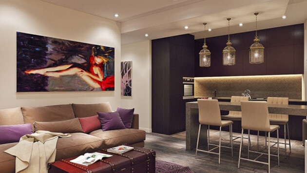 Цветовое решение Основные цвета кухни-гостиной — тёплый бежевый в разных оттенках, шоколад и пурпурный. Несмотря на то что общая отделка комнаты выполнена в светлых тонах, цветовое зонирование здесь всё же присутствует: так, за счёт мебели зона кухни получилась более тёмной (для неё выбрали деревянные фасады винного оттенка), а разделителем выступает барный стол из искусственного камня. Интерьер спальни Спальня — самая малоосвещённая комната в квартире, и дизайнеры этот недостаток оригинально обыграли, ещё больше усилив и подчеркнув атмосферу кокона тёмными стенами. Это позволило превратить спальню в уединённый и комфортный уголок для сна. На правильные ощущения работают разнообразные уютные фактуры: постельное бельё, мягкое изголовье, пушистый ковёр и весь остальной текстиль. Оформление детской комнаты Совсем другая по стилистике и цветовой гамме получилась детская для девочки. Мятные стены, белая мебель, кролики на стенах, цветочный текстиль и люстра в виде чайного сервиза — все эти детали превратили комнату в настоящую лаконичную спальню маленькой принцессы. Дизайн санузла В ванной комнате общая цветовая гамма квартиры сохраняется с некоторыми изменениями: на смену пурпурному и шоколадному приходит глубокий бордовый цвет. Стены отделаны бежевым керамогранитом, а для пола дизайнеры выбрали контрастную узорную плитку. По словам Натальи и Марины, основная идея интерьера родилась уже на первой встрече с заказчицей. Они сразу же сошлись во мнениях по поводу атмосферы и цветового решения: в качестве палитры решили взять тёплые, охристо-бежевые оттенки в сочетании с густыми и тёмными шоколадными, а также добавить яркие акценты пурпурного цвета и модного сейчас оттенка марсала. В целом интерьер получился довольно эклектичным и оттого уютным: современная мебель в этой квартире сочетается с винтажными предметами, журнальный столик в виде ретрочемодана соседствует с коваными светильниками над барной стойкой, а абстрактная живопись — с ростовым зеркалом в массивном состаренном багете. Читайте также: