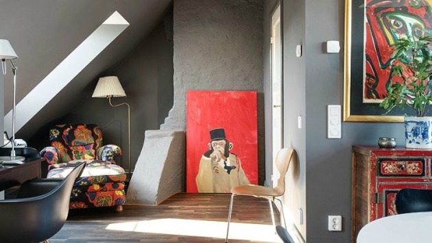 Психология цвета говорит нам, что серый в интерьере вызывает ощущение гармонии и спокойствия, но вот если ваша цель — необычность и уникальность, то работа с колоритом усложняется. К счастью, серый — это идеальный фон для ярких акцентов и смелых решений. Кики Уолманссон, генеральный директор марки одежды Svea Владелица лофта в Гётеборге мечтала о создании роскошного интерьера в нью-йоркском стиле. Кики прекрасно разбирается в дизайне и много путешествует по делам компании, поэтому для неё идеальный дом сочетает в себе комфорт и изысканность номеров пятизвёздочных отелей. А лучший декор — это современные произведения искусства. Воплотить мечту Кики помогала шведская дизайн-студия Alvhem, с лёгкостью придавшая традиционному скандинавскому стилю манхэттенский шик. Построенный в 2013 году кондоминиум находится в спокойном и тихом районе Гётеборга, окна выходят на парк, неподалёку — центр города с популярными ресторанчиками и магазинами. Статьи по теме Как сделать серый интерьер нескучным: 15 советов Уютная трёшка в серо-бежевых тонах с японской спальней Гостиная Гостиная использует возможности серого цвета стен по полной — на его фоне восточные красные ковры, сине-белые стулья в стиле Людовика XV и яркие пятна подушек и картин сливаются в цельный, динамичный и насыщенный образ. Кухня объединена с зоной отдыха и столовым уголком в открытой планировке, наполненной светом. Кухня Холодильник из стали, дымчато-серый каррарский мрамор столешницы и фартука, блеск латунных ручек и яркие пятна красного на фоне тёмного дубового паркета и матовых стен сложного серо-сизого оттенка — маленькая кухня выглядит сногсшибательно. Здесь светло днём от мансардного окна, а вечером в дело вступает светильник с возможностью регулировки направления источника света. В островок предусмотрительно встроен винный шкаф. Коридор и терраса Из оформленной яркими картинами и зеркалом в полный рост прихожей широкая лестница ведёт на второй этаж с выходом на террасу. Обратите внимание на грубую текстуру стен и экстравагантную лампу с основанием в форме золотого пистолета в коридоре. На высоте шестиметрового потолка роскошная хрустальная люстра доминирует в лестничном пролёте. Вид с балкона на оранжевые крыши города делает любой завтрак незабываемым. Спальня Стены спальни выкрашены в спокойный цвет серо-голубого оттенка, на таком фоне выделяются текстурированные открытые деревянные балки мансарды. Здесь много места для хранения книг и одежды, а благодаря потрясающему виду из окна кровать словно парит над городом. Одетые по-деловому обезьянки на картине — талисман Кики, их можно ещё не раз увидеть в декоре интерьера. Ванная В ванной мрамор на полу холодного серого оттенка приглушает яркость пыльно-розового цвета стен. Это очень красивое сочетание, и общий эффект комнаты — атмосфера спокойствия, тепла и расслабленности. Душ за стеклянной дверью привлекает внимание своей необычной треугольной формой, а золотые детали декора ещё раз утверждают роскошь как обязательный элемент дизайна этой квартиры. Мы привыкли к активному использованию белого и чёрного цвета в скандинавском стиле, а нью-йоркские лофты ассоциируются, скорее, с коричневыми и нейтральными оттенками. Тёмно-серый в качестве фона для ярких акцентов стал тем компромиссом, который и обеспе