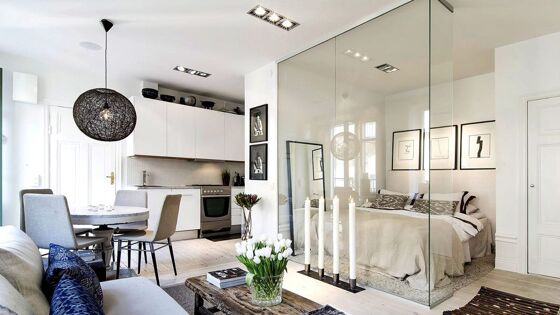 Перегородки для зонирования пространства в комнате Большинство городских квартир не могут похвастаться внушительными габаритами. Чаще всего помещения имеют скромные размеры. Стремление к простору толкает многих владельцев жилья на совмещение нескольких комнат в одну. Как следствие, встаёт вопрос грамотного зонирования пространства в комнате. Для перегородки важно, чтобы она выглядела органичной частью интерьера и одновременно выполняла свою функцию разделения помещения на зоны. Какие материалы можно использовать для изготовления, как подобрать форму перегородки и советы экспертов по её установке – в этом материале. Красивая перегородка может стать украшением комнаты Содержание статьи 1 Зачем нужны перегородки 2 Материалы перегородок в комнате для зонирования: фото и основные свойства 2.1 Акрил 2.2 Бамбуковые стволы 2.3 Гипсокартонные конструкции 2.4 Изделия из дерева 2.5 Зеркальные поверхности 2.6 Живая изгородь в доме 2.7 Бетон и кирпичи 2.8 Кованый металл 2.9 Пластик и его особенности 2.10 Перегородки из стекла 2.11 Применение текстиля для зонирования 3 Виды перегородок 4 Использование раздвижных перегородок для зонирования пространства в комнате 5 Дизайнерские решения 6 Рекомендации экспертов 7 Магия трансформации Зачем нужны перегородки В большинстве случаев установка перегородки требуется в гостиной комнате, если она совмещена со спальней хозяев или рабочим кабинетом. В детской также может потребоваться зонирование, чтобы отделить игровую площадку от места для сна и учёбы Совмещение кухни и столовой потребует отделения пространства для приготовления пищи от обеденной группы. Можно выделить четыре повода установки перегородок для зонирования пространства в комнате: разделение функциональных задач, например, отделение гостиной от детской; разделение рабочего и личного назначения помещения; преобразование комнатыв зависимости от времени, например, гостиной в спальню на ночь; визуальное изменение площади помещения, стремление расширить или уменьшить ее. Последнее время стали популярны квартиры – студии. В большом помещении перегородки необходимы для организации трёх и более функциональных зон Преимущество лёгких конструкций в том, что они легко устанавливаются и так же легко при необходимости снимаются или переставляются на новое место. Они не требуют серьёзных вложений или усилий на установку. Считается, что перегородки – идея, пришедшая к нам из Швеции, но с этим выводом можно поспорить Вспомните старые русские избы, в которых для отделения комнаты использовались цветастые занавески. Этот текстильный вариант зонирования использовался с незапамятных времён. Зонирование лёгкими конструкциями даёт возможность использовать буквально каждый сантиметр площади Популярные методы разделения пространства на зоны: установка арочных конструкций; возведение фальшстенок; разделение зон при помощи мебели; установка подиума; монтаж раздвижных дверей; использование текстильных элементов; применение разных вариантов освещения. Нет каких-либо строгих правил для обустройства перегородок, но есть рекомендации экспертов, на которые стоит обратить внимание. К примеру, разделяя гостиную на зону отдыха и рабочее место, оптимально будет соблюсти пропорции один к трём. При этом большая часть должна располагаться в зоне, 