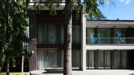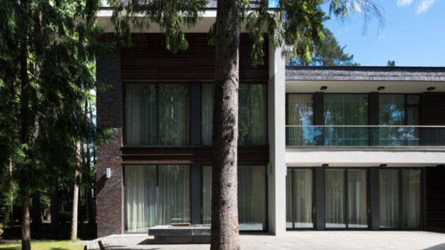 Потрясающий дом в элитном посёлке «Сады Майендорф» в Московской области с первого взгляда поразил нас своим архитектурным решением. Архитекторы Саша Лукич, Сретен Йованович, Йовица Вуичич и дизайнер интерьеров Анна Громова сделали так, что мы надолго запомним этот практически идеальный проект. Архитектор Саша Лукич, бюро Portner Architects Бюро Portner Architects создал в 2005 году сербский архитектор Саша Лукич. Штат сотрудников из 40 архитекторов и инженеров занимается созданием знаковых объектов большой архитектуры и элитных загородных домов в духе функционализма и современной архитектуры чистых форм. Бюро — победитель девяти международных и российских конкурсов. Его сотрудники реализовали почти 50 частных резиденций и около 80 крупных общественных объектов на территории РФ и Евросоюза. www.portner.ru Материалы, использованные в проекте, отобраны с особой тщательностью. Для отделки фасадов использован клинкерный кирпич голландского завода CRH, отборный натуральный камень доломит из Владимирской области, а навесной объёмный деревянный фасад сделан из термообработанного балканского ясеня. Для мощения территории использован термообработанный камень габро и деревянный декинг из тика. — Участок в виде треугольника площадью 2 250 квадратных метров из-за своей формы считался неликвидным, несмотря на то, что был расположен в самом дорогом посёлке России. Заказчик обратился в нашу компанию для решения сложной задачи, выбрав подход Portner Architects — логику архитектурной школы функционализма (где всегда функция определяет форму, а форма — фасад) и наш почерк — стилистику современной архитектуры. Будто архитектурная мозаика в стиле лего, дом собран, реализуя конкретные нужды клиентов, и стал настоящей крепостью — большой, неприступной и очень стильной. Учитывая треугольную форму участка, архитекторы решили спроектировать дом из двух корпусов разного функционального назначения, которые образуют приватный внутренний двор. На патио выходят окна всех основных жилых помещений и спа-зоны, все они выполнены с максимальным раздвижным остеклением. В основном корпусе на первом этаже расположена просторная зона гостиной и каминный зал, столовая и сервировочная кухня, на втором этаже — три спальни со вспомогательными помещениями. На цоколе с отдельным входом предусмотрены помещения для персонала, производственная кухня, технические помещения и гараж на шесть машин. Во втором корпусе, закрывающем патио, расположена спа-зона с плавательным бассейном и сауной, на верхнем этаже — кабинет и гостевая спальня. Ещё в одной небольшой, ориентированной к улице, — помещения для водителей и охраны. Внешний вид дома соответствует его элитному расположению. Для фасадов использованы натуральные материалы земляных цветов в палитре коричнево-бежево-серых тонов. Клинкерный кирпич голландского завода CRH коричнево-серых оттенков с присутствием ангоба фиолетовых оттенков. Отборный натуральный камень доломит из Владимирской области — серо-бежевых тонов с тонкими серыми прожилками. Навесной объёмный деревянный фасад из термообработанного балканского ясеня с выраженным рисунком, усиленным использованием чёрной патины, обработан морилкой кофейного оттенка и маслом. Для мощения территории использован термообработанный камень габро, гранит антрацитового оттенка и дер
