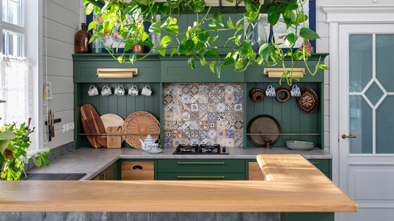 Каждый месяц мы выбираем самые интересные идеи для дома из российских проектов. Какое из решений понравилось вам больше всего? Дизайнер Мария Нечаева использовала в оформлении кухни плитку с рисунком под майолику и нашла ей необычное применение. Часть плитки уложили за варочной панелью, а остальная пошла на отделку барной стойки с внешней стороны. Дизайнер Кристина Изотова в детской решила встроить выдвигающийся спальный блок с дополнительным матрасом — на случай, если к малышу приедут погостить сестренки и братишки с ночевкой. Дизайнеры декорировали крашеные стены в квартире молдингами и плинтусами в цвет стен: это визуально приподняло низкие потолки (всего 2,45 м). Юлия Кандыбей спроектировала изголовье из мягких, обитых тканью прямоугольных блоков небольшого размера. Между ними предусмотрено небольшое пространство для временного хранения журналов, книг или рисунков. Вместо верхнего ряда шкафов на кухне дизайнеры повесили два фасада, в одном из которых прячется вытяжка. При этом создается иллюзия, что это верхние части буфетов. В ванной в проекте Property Lab+Art есть окно. Чтобы не закрывать его шторами или жалюзи, дизайнеры придумали украсить стекло цветными витражами. Дизайнеры Line Design Studio изначально планировали сделать фартук из кварца под мрамор, но потом нашли экономичную замену — использовали крупноформатную плитку. Чтобы визуально расширить пространство маленькой студии, кухню спрятали за дверцами. Их выкрасили в тот же цвет, что и стены, так что в интерьере шкаф практически незаметен. Чтобы спрятать фасад кровати-трансформера, дизайнер Мария Пузанова решила украсить стену абстрактной фреской. Для расширения пространства вдоль всей стены в прихожей установили зеркальные фасады шкафов. Заодно решили проблему с местами для хранения.