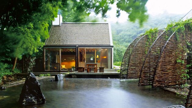 Свои обычаи есть у каждого народа. К примеру, культурное наследие Японии — это чайная церемония. Жители скандинавских стран гордятся своими банными ритуалами. Специалистам студии Wingårdh удалось объединить эти традиции в одном проекте. Минималистичный Mill House похож на японский домик для чайных ритуалов, внутри него в соответствии со шведским обычаем оборудована сауна Небольшой (50 м ) комфортабельный домик построен на юге Швеции, на территории старой деревенской фермы. По функционалу это гостевой коттедж со спальней, кухней и сауной, стоящий рядом с основным домом конца XIX-го века. Простая архитектура Mill House напоминает обычные постройки с треугольной остроконечной крышей, которые любят рисовать дети. На самом же деле он соответствуют классическому образу шведского загородного дома, однако традиционный скандинавский стиль здесь сочетается с восточным колоритом, а в основе интерьера заложена японская эстетика. Внутри постройка поделена на две равные части: в одной расположена жилая зона с гостиной и кухней, в другой находится санузел и сауна. В мансарде оборудовали спальню. Рядом с домом дизайнеры создали ландшафт, напоминающий традиционные японские сады. А поскольку банный ритуал включает в себя не только процедуры в парной, но и окунание в холодной воде — рядом с домиком соорудили небольшую купель. Она заполняется дождевой водой, которая стекает с крыши дома через специальный водосток. К дому ведет выложенная камнем дорожка с чередой необычных арок, плетенных из прутьев Потоки воды, переливающиеся через края купели, создают особую атмосферу умиротворения и покоя, присущую японским садам В интерьере дома царит сдержанная палитра, состоящая из оттенков светлого дерева, чистого белого цвета и приглушенных серых тонов. В отделке использован дуб и известняк, сочетающиеся с деталями из матового металла. Японскую тему в интерьере продолжают открытые потолочные балки Большое окно в мансарде можно закрыть белыми полупрозрачными шторами, напоминающими японскую рисовую бумагу Фасады отделаны дубовыми досками, обожженными по старой японской технологии Shou Sugi Ban, которая позволяет подчеркнуть красивую текстуру дерева и сделать его более прочным и стойким к внешним воздействиям План дома