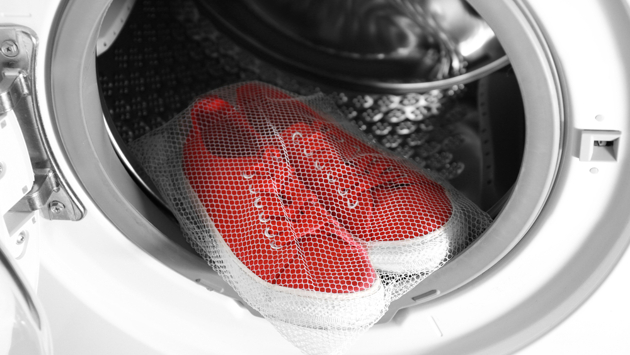 - положите пару кроссовок в специальный мешок, чтобы они не бились друг об друга во время стирки (также можно замотать их в полотенце). Важно не забивать барабан полностью, поэтому стирайте за один раз не больше двух пар;