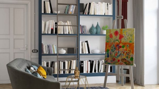 Так, для хранения книг дизайнеры предусмотрели вместительный синий стеллаж из гипсокартона с лесенкой, которая позволяет без труда доставать книги с верхних полок. Рядом расположился уютный серый диван Amouage от Busnelli с небольшим кофейным столиком из Zara Home и мольберт. Для окон выбрали выбрали гардины светло-серого цвета из плотной ткани.