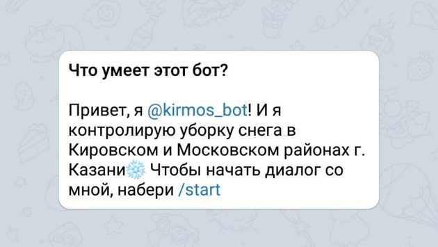 Администрация Кировского и Московского районов запустила сервис, который точно понравится интровертам. Можно заказать уборку снега во дворе через телеграм-бот.Шаг №1 Открываем чат-бот, жмем «старт». Скрин чат-ботаШаг №2 Пишем точный адрес места, где не убрано. Максимально подробно, как на фото. Скрин чат-ботаШаг №3 Все, больше от вас ничего не требуется. Если через два-три дня двор не почистят, звоните по телефону 557-76-10. Скрин чат-бота Есть еще кое-что, что должно понравиться интровертам. Это огромная территория, по которой можно гулять и никого не встретить. Никого, кроме пустоты. Кажется, это ее официальная резиденция в Казани – прямо за «Ак Барс Ареной».