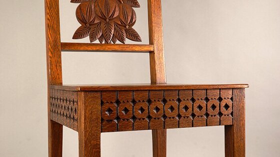 Стул, сделанный из массива дуба, обращает на себя внимание резьбой: декоративные элементы расположены не только на спинке, но и на царгах — деталях, которые находятся под сиденьем и соединяют ножки. Мастера использовали два вида резьбы: контурную плоскорельефную (с углубленным фоном) и трехгранно-выемчатую. Обе характерны для абрамцевских столярно-резчицких мастерских — это типичные формы русской резьбы, которые существуют испокон веков.