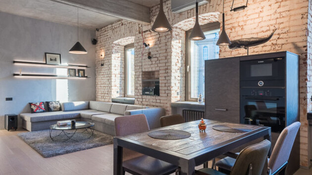 Основной акцент интерьера сделан на стены, с которых удалили штукатурку, открыв оригинальный кирпич XIX века.