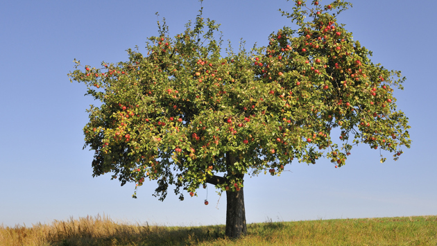 Яблоня потеряла центральный проводник, а ели не потеряли.