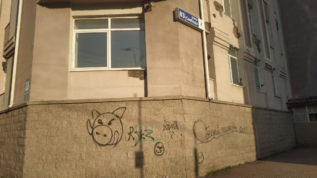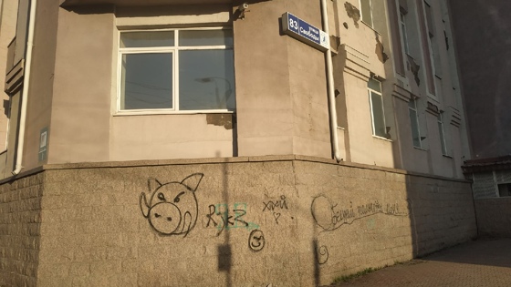 В Челябинске начал «сыпаться» жилой дом на улице Свободы со свиньей на фасаде (неизвестный «художник» оставил след на стене в виде морды сердитого хряка, не забыв и нецензурное слово рядом написать). Свиная морда на фасаде давно, а вот осыпаться покрытие над нею стало недавно. Ответственные лица, судя по всему в курсе, - опасный участок, проходя по которому можно получить каким-нибудь кирпичиком по голове, обозначен красно-белой лентой. На других стенах также видны следы разрушения. Дом жаль – сейчас он выглядит не лучшим образом и явно нуждается в обновлении. Так как здание угловое, часть его находится на Карла Маркса. Если пройти по этой улице в сторону Российской, можно увидеть и другие «красоты» - очередные афиши (в том числе весьма сомнительные) на заборе (веселеньком, желтом), загадочные «письмена», слегка провалившийся тротуар, ямы на пешеходном переходе и старинный деревянный дом – заброшенный, исклеенный объявлениями, за отошедшими досками в стенах которого «прячутся» пустые бутылки из-под спиртного и прочий хлам. А еще на этом участке улицы Карла Маркса, между Свободы и Российской, сегодня, 21-го апреля, замечена снежная куча (наверное, одна из последних в городе) и деревце, пробившее себе путь к солнечному свету через плитку.