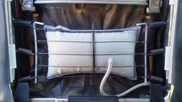 Еще один вариант предлагают предприниматели в Китае. Стоимость всего оборудования - 1000 рублей. Установку можно проводить без снятия кресел. В основе решения лежит пневмоподушка. Она фиксируется на жесткой накладке, а после накачивается. Можно заказать насос за 500 рублей и электромагнитный клапан. После можно вывести все в кнопку.