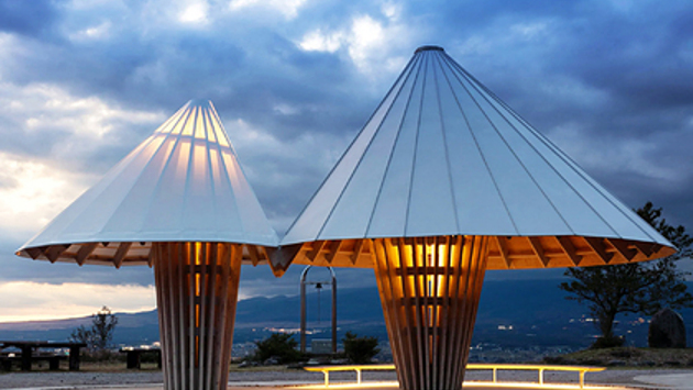 Днем сооружения напоминают заснеженные горные вершины, а в темное время суток подсвечиваются и превращаются в подобие маяков. Туалеты расположили в парке на площадке, с которой открывается вид на Фудзияму — место пользуется популярностью у местных жителей и туристов.