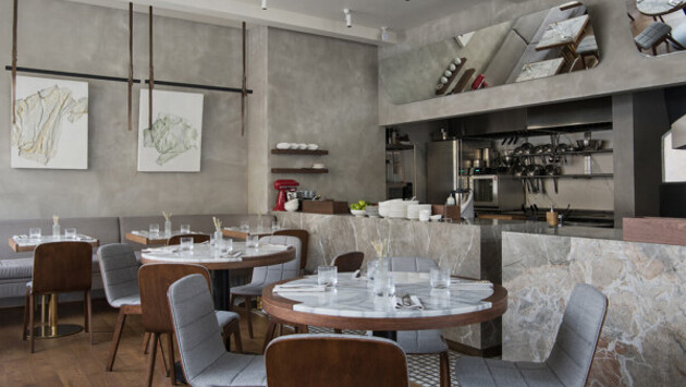 Небольшая площадь повлияла на решение сделать кухню открытой. Гости могут увидеть, как готовится заказ, общаться с поваром и при желании даже встать рядом и раскатать тесто на мраморной столешнице.
