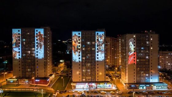 В Красноярске фасады сразу четырех домов были украшены мэппинг-подсветкой. Так, например, на фасаде дома на Красной Армии, 121 красноярцы могли наблюдать проекцию с изображением Андрея Поздеева.