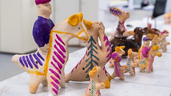 Барашек на счастье В минувшую пятницу центральная площадь Курска наполнилась свистом. И это совсем не тот случай, когда суеверный человек может сказать «не свисти – денег не будет». Напротив, традиции обещают свистунам плодородие и богатство. Почему? Об этом школьникам рассказали в региональном туристско-информационном центре Курской области. В этот день здесь в рамках проекта «Культура для школьников» проходила «Экскурсия в мир кожлянской игрушки». Кожлянская игрушка наравне с курским соловьём давно стала негласным брендом Курской области. Мастер-класс для учащихся 5 «б» класса 21-го лицея провёл потомок известных мастеров Валентин Тимофеев. Старинное искусство Валентин Тимофеев популяризирует при каждой возможности – на различных фестивалях, ярмарках и других массовых мероприятиях. Под руководством мастера школьники попытались слепить барана, который держит в «руках» шар. – Именно в руках, – подчёркивает мастер, – потому что в курских традициях фигура лепится по аналогии с человеческой фигурой. Шар – это зерно. Всего в кожлянской игрушке 68 сюжетов. У каждого своё значение. Прежде чем начать работать с глиной, она должна быть подготовлена соответствующим образом – как говорят мастера, вызреть. Раньше для этого использовались кожаные мешки, сейчас – материалы попроще. Вызревает глина в течение одного года. Все фигурки похожи одна на другую. Лепятся в определённой последовательности. Сначала полое туловище, затем шея, плавно переходящая в голову. К ней приделываются рожки и скручиваются. Воду при этом не используют, материал должен оставаться упругим. В последнюю очередь, после того как приклеиваются руки и ноги, барану в «руки» вкладывают шарик – то самое зерно. – Осталось проделать отверстие так, чтобы игрушка свистела, – говорит мастер. Обжигали глиняные игрушки после уборки урожая в сухую погоду. Современных муфельных печей в старину не было, поэтому делали это в горне после того, как глина хорошенько просушится. В двадцатом веке мастера кожлянской игрушки полюбили анилиновые краски, а прежде использовали природные красители – свёкла, одуванчик, трава, малина. Добавляли также яйцо, молоко, сахар или мёд. Основные узоры росписи – крестики, точки, полосы, сетки и круги. Одежда, головные уборы персонажей, те же рога баранов – яркие. – У каждого цвета своё значение, – рассказывает Валентин Тимофеев. – Фиолетовый – зима, зелёный – весна, оранжевый – лето. Малиновый – цвет урожая, яблок, смородины, вишни. Это четыре основных цвета кожлянской игрушки. Кроме того, на Курщине фиолетовый считался цветом богатства. Сделать игрушку для настоящего мастера – дело простое. – Хороший мастер делает в час 12–14 игрушек, – говорит Валентин Тимофеев. – Как-то на ярмарке в Старом Осколе слепил кожлянского медведя с закрытыми глазами. ЗАЯЦ – СИМВОЛ ЛЮБВИ Посуду делать у наших предков считалось мужским ремеслом, а игрушками занимались преимущественно женщины, рассказали сотрудники центра. Мастерами, работавшими с глиной, славился не только Курчатовский, но и, например, Суджанский район, где жили казаки, многие из которых очень уважали гончарное дело. Хорошим тоном в их традициях считалось дарить на свадьбу глиняную куклу. Лепили предки даже необычных фантастических существ с двумя лицами – их называли кудесниками. – В кожлянско