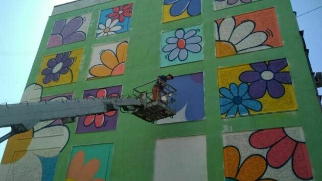 Художники говорят, что фасад дома сложный, рельефный, поэтому на работу потребуется порядка трех недель. На одну сторону ушло около 100 литров краски. Работы ведутся с соблюдением всех технологий, предварительно поверхность загрунтовали, далее нанесли белый фон, что позволит рисункам дольше держаться на поверхности.