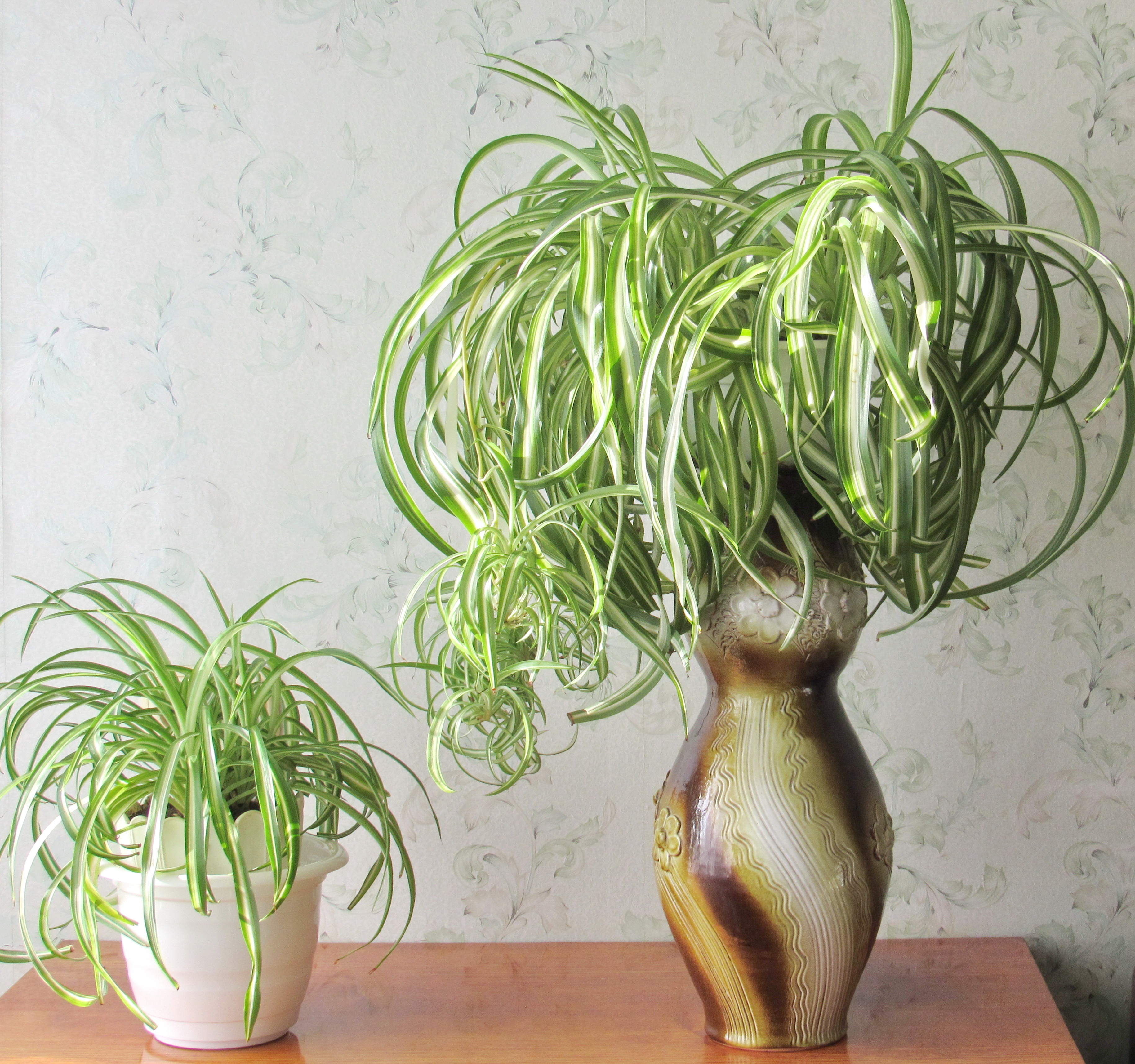 Как я уже писала, нетребовательность хлорофитумов является их очень важным достоинством. Ведь их не обязательно выращивать на окне — на стене комнаты, кухни шикарно и изысканно будут смотреться свисающие кучерявые листья и детки-лианки этого растения. Почему я упомянула кухню, спросите вы? А все очень просто: хлорофитум считается не только красивым, но еще и очень полезным растением. Он очищает воздух от вредных микроорганизмов, поглощает угарный газ и другие вредные примеси.
